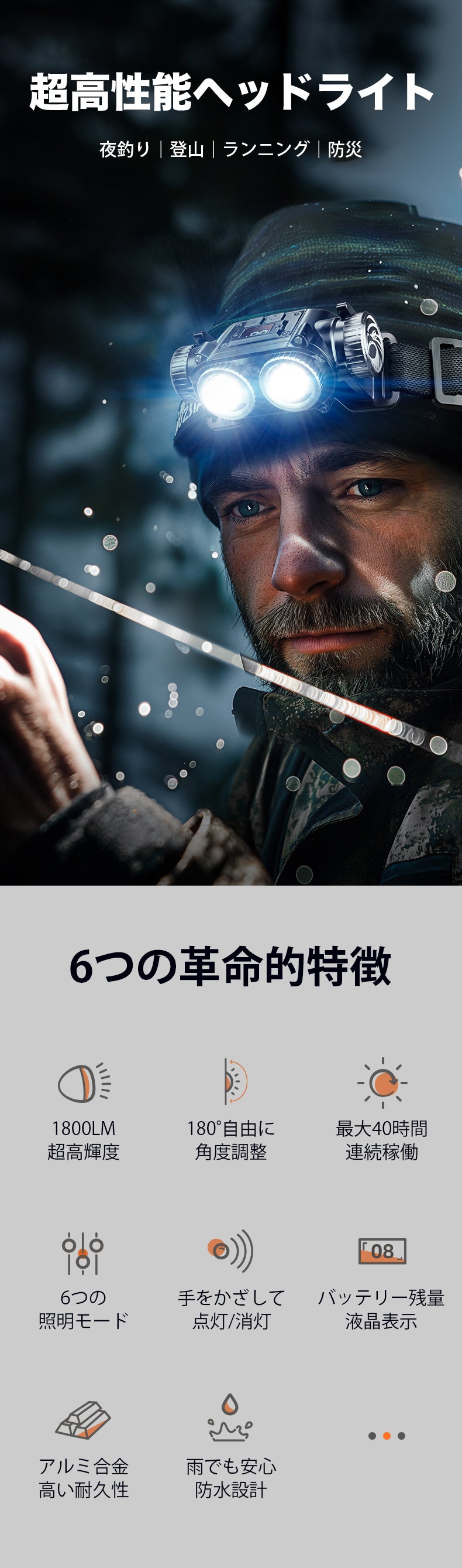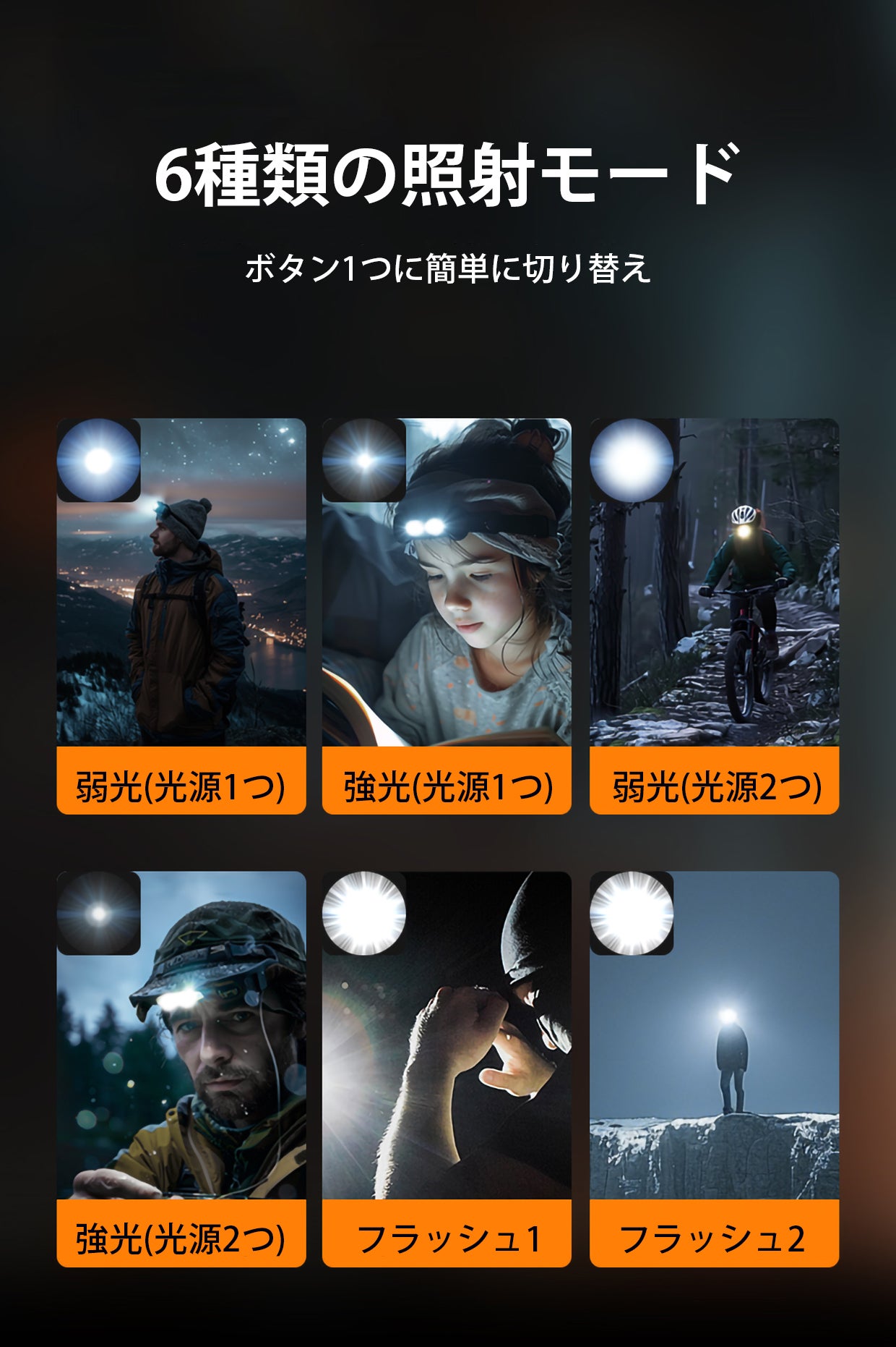本製品は6種類の照明モードを搭載しており、用途によって使い分けることができるので、夜間のアクティビティが今まで以上に快適になります。