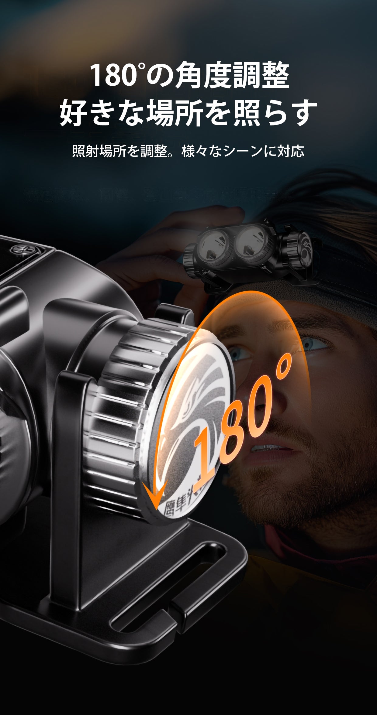 照射角度を最大180°まで調整できるので、頭を動かさずに好きな場所を照らせます。