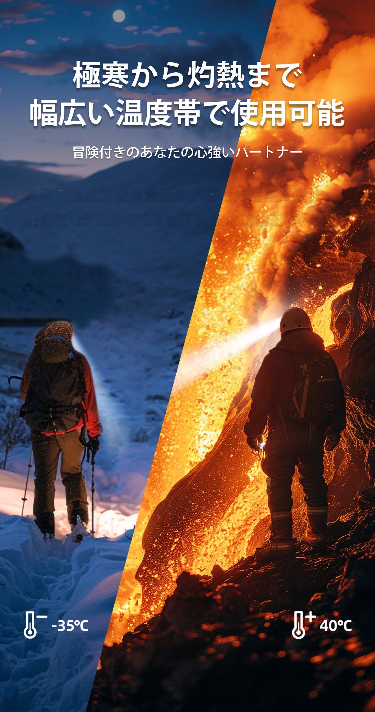 耐久温度は-35℃〜45℃となっており、極寒の雪山から灼熱の火山まであらゆる場所であなたの冒険をサポートします。