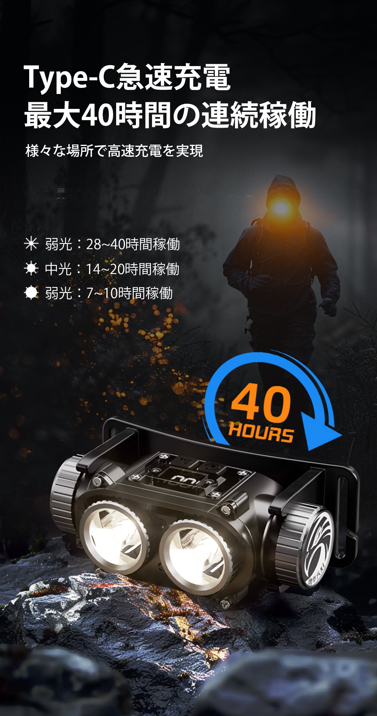 Type-Cの急速充電に対応しており、2時間の充電で最大40時間使用できます。
