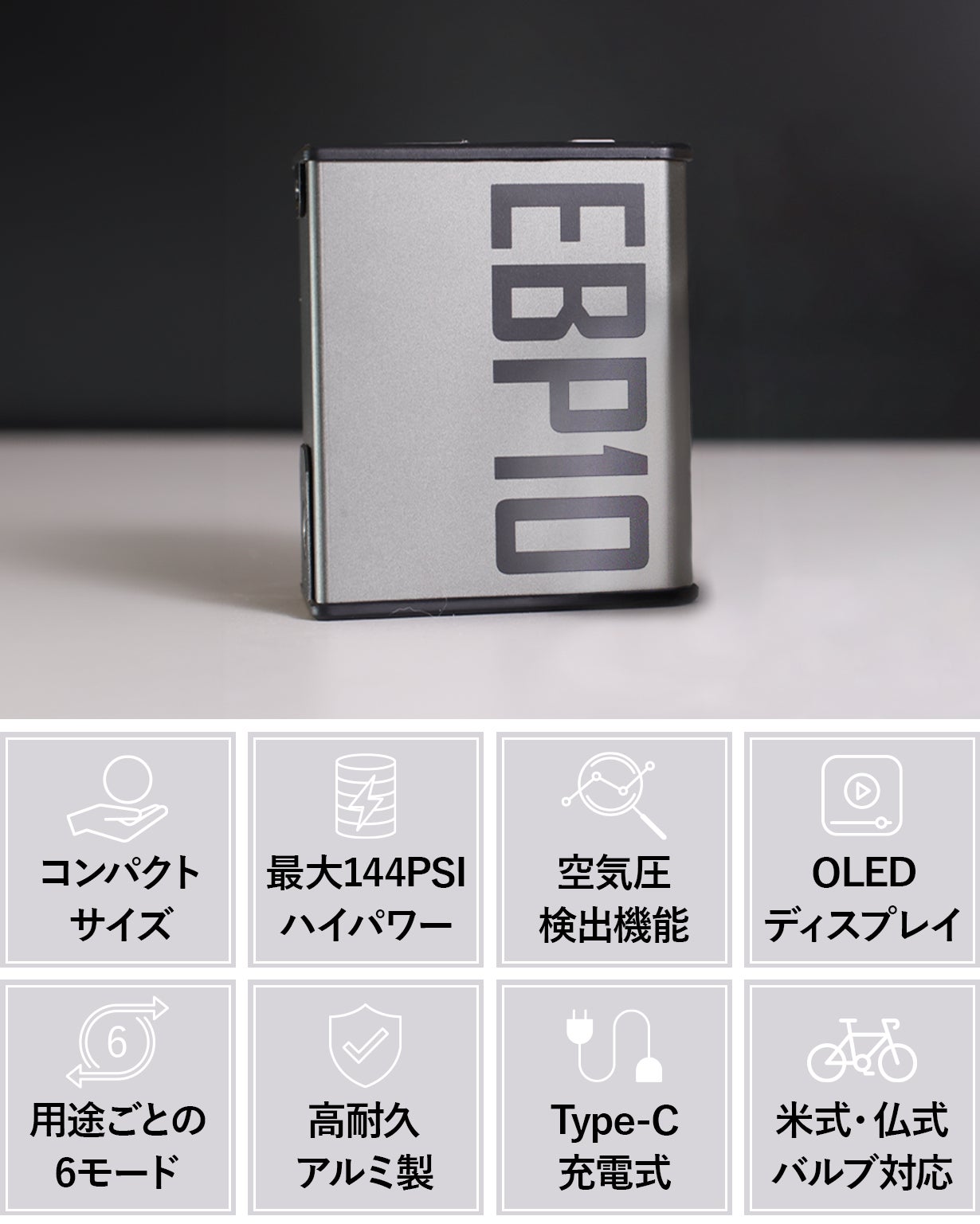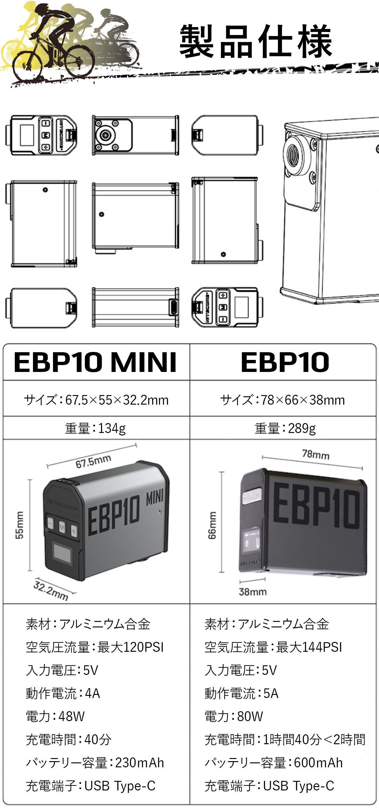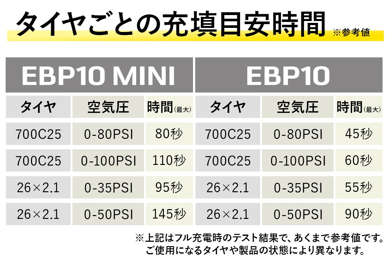 フルパワーで使用すると、EBP10 MINIは700C25のタイヤ0から80PSIまで2本充填できます。