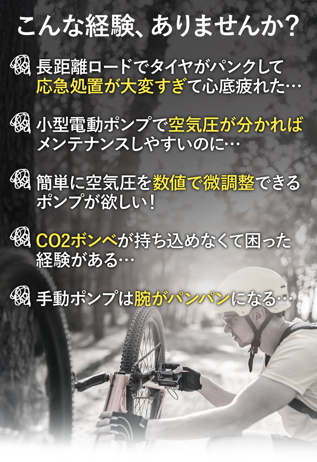 CO2ボンベや手動ポンプだと空気圧検出が不可能ですが、空気圧検出機能のある大型ポンプは持ち運べない…。