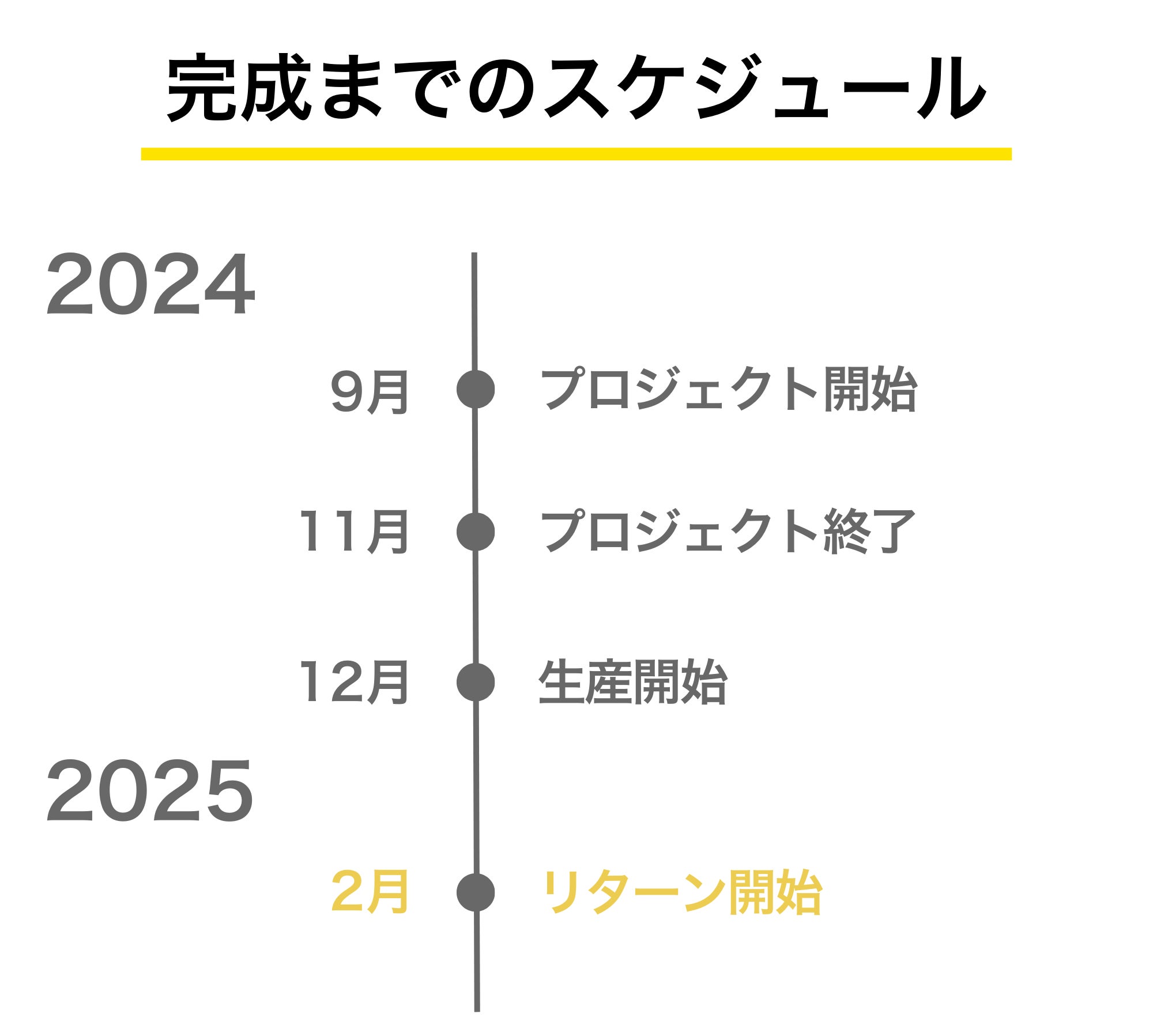 ※本文中に記載させていただいたスケジュールは、あくまでプロジェクト公開時点の予定です。クラウドファンディングを経て輸入を行う性質上、配送遅延のおそれがございます。