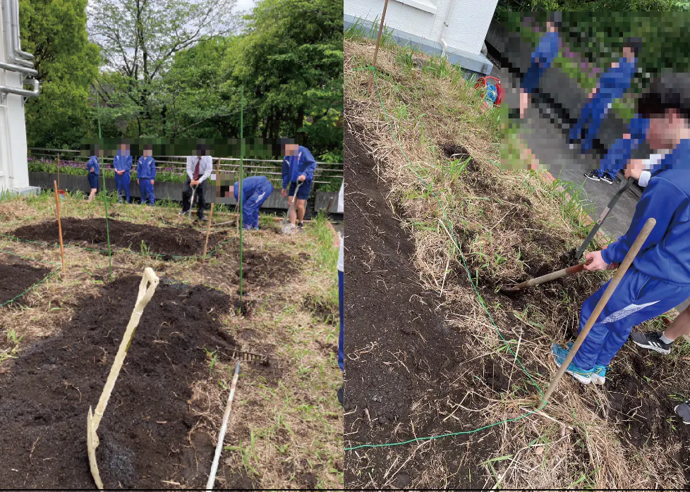 学校校舎横の敷地に畑を耕す生徒達
