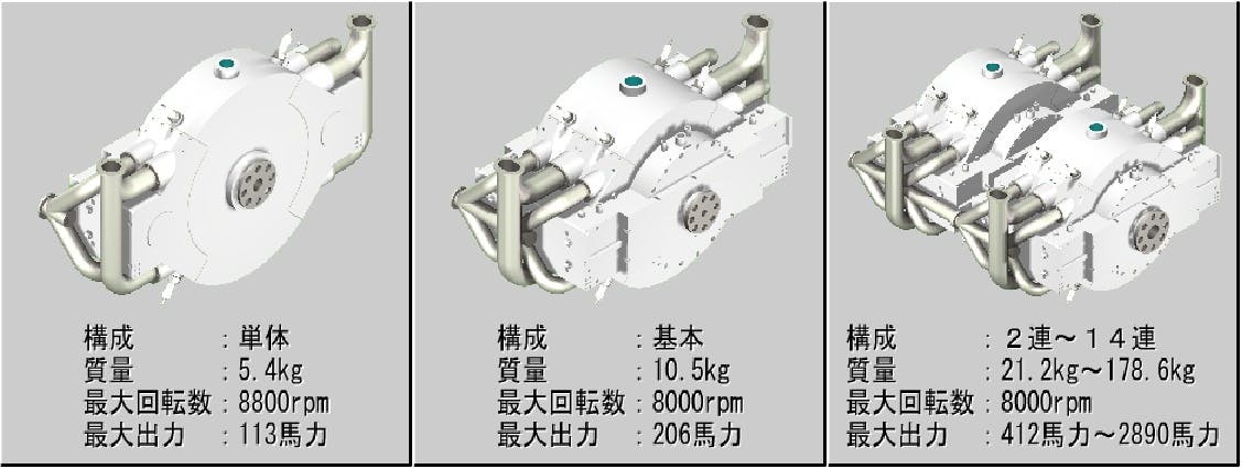 今回開発する次世代エンジンの仕様は、重量10.5kg・最大回転数8000rpm・出力206馬力で超軽量・高出力なボア44ガソリンエンジンで、スポーツカー・空飛ぶ車・ドローン用でソフトウエアによる設計解析・製作図面・組立図面・3Dデータが完了しています。