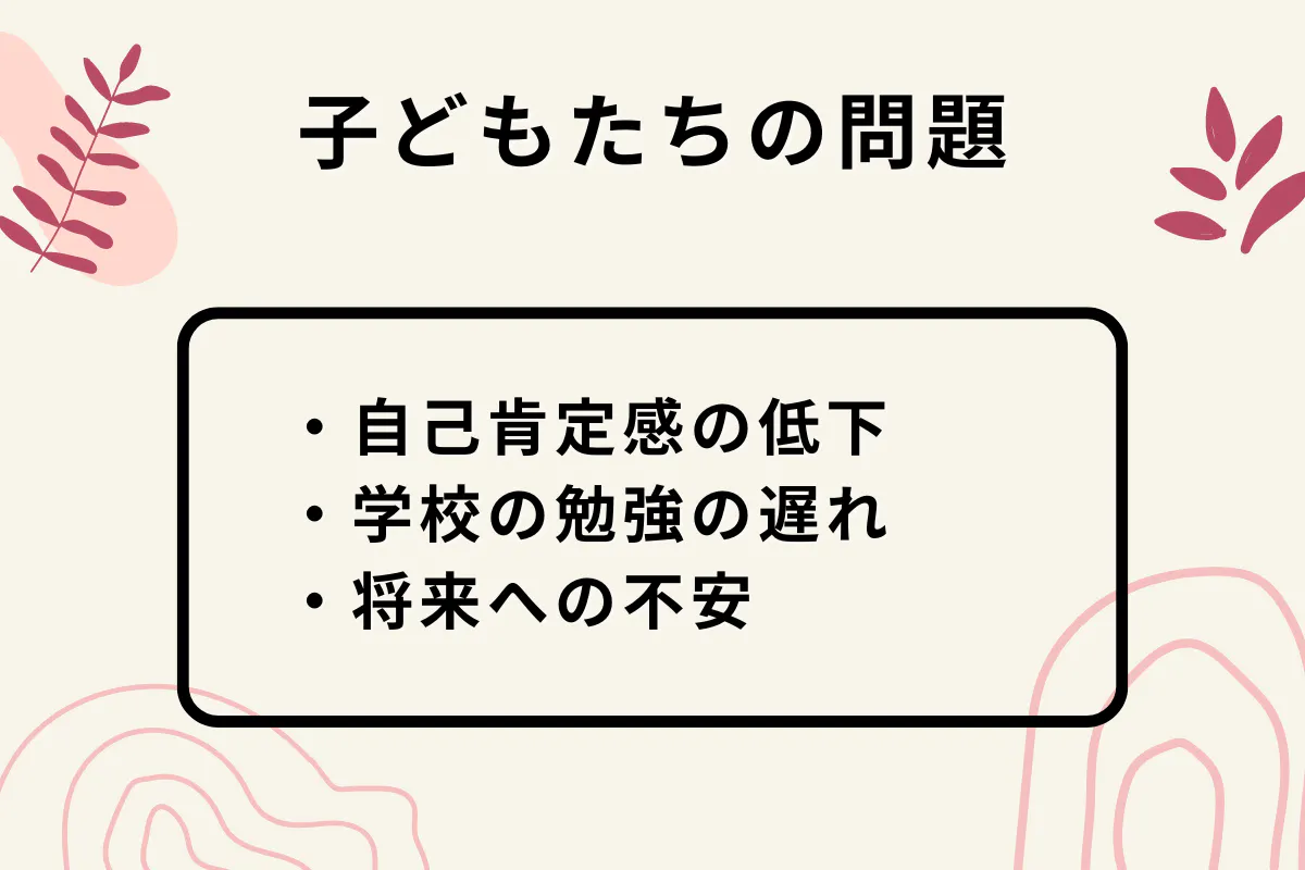 これらの問題は相互に関連しており、子どもたちの心身に大きな影響を与えます。自己肯定感が低くなると、学業に対する意欲が減退し、それがさらに学びの遅れを招くことがあります。また、将来への不安が増すことで、さらに精神的な負担がかかり、問題が深刻化する可能性もあります。