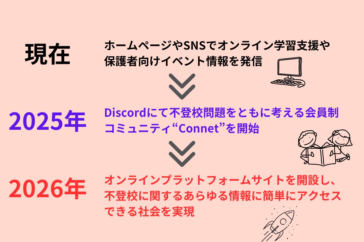 私たちが目指す未来は、不登校に関するさまざまな情報が容易に共有される社会です。そのためには、専門家や行政が情報を「発信」できる場所と、保護者や子どもが自分に合った情報を「選んで」「入手」できる場所が必要だと考えています。このような機能を備えたオンラインプラットフォームサイトを作りたいと考えています。