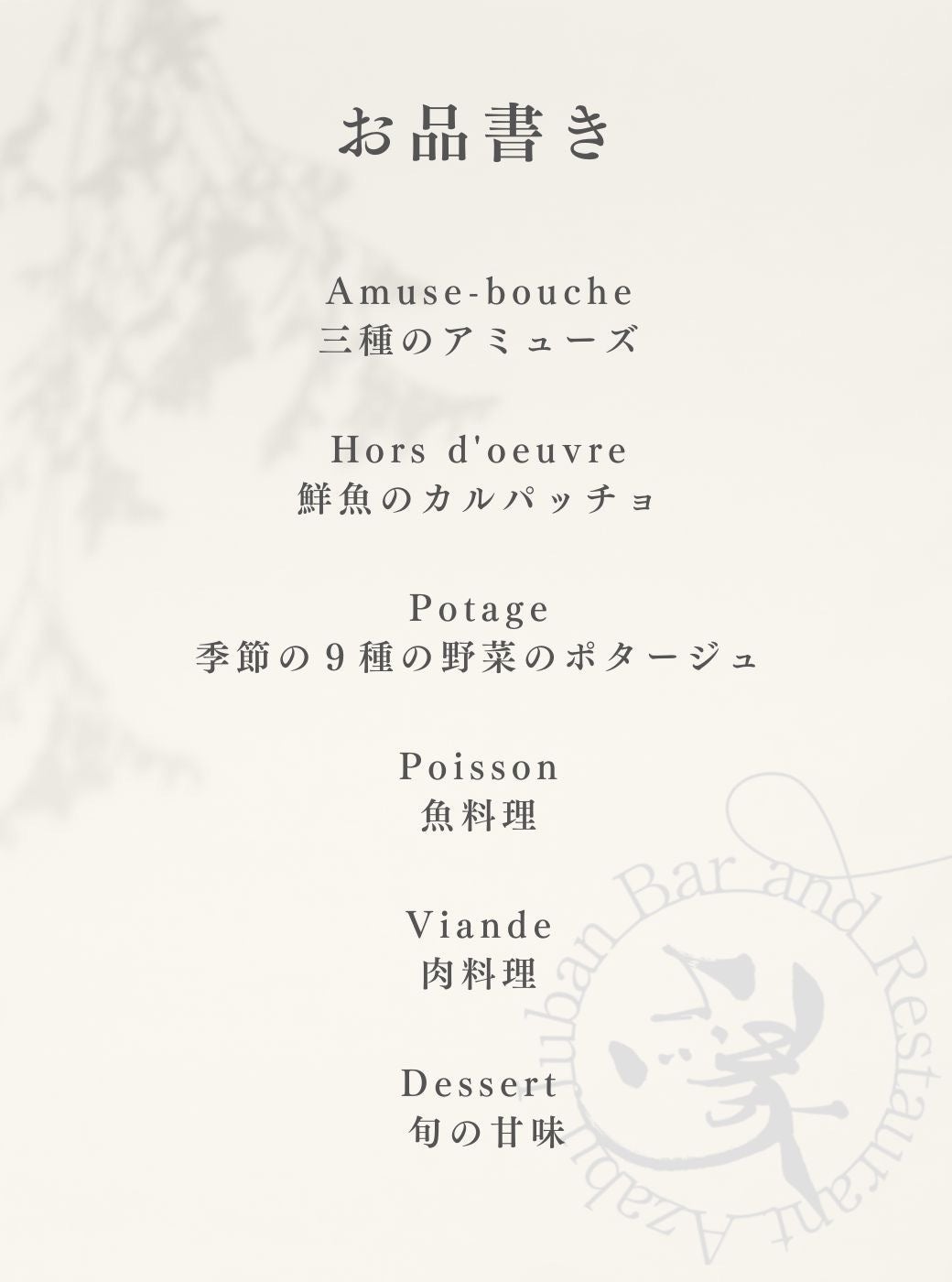 季節の旬の食材を使用したシェフのおまかせコースや、こだわりのあるドリンクを提供しています。メニューは定期的に変更され、常に新しい体験を提供します。