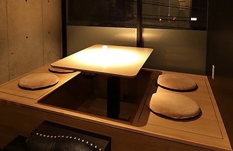冬は掘りごたつになり冬の風情を感じます。レースカーテンを閉じれば個室に様変わります。