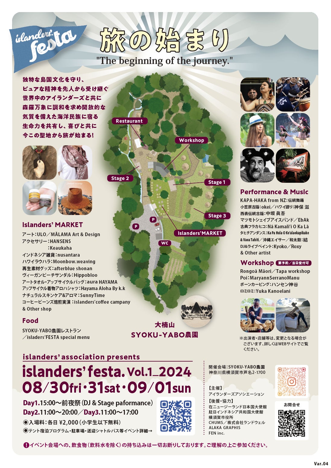 長年ハワイ関連のイベントを各地でオーガナイズしてきたプロデューサーがアイランダースピリットに共感・共鳴してくれるアーティストやクリエイターに声を掛け、横須賀芦名の大楠山の麓にある聖域〜SYOKU-YABO農園の全面協力を得て開催することになったこの第一回目のイベント”islanders'FESTA”。一緒に旅に出る仲間を日々集めながら開催の成功を目指しています。