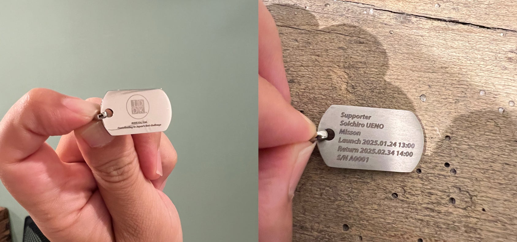 今回のマグカップと共にリターン第二弾として、ドックタグを追加することになりました。金属製となっており、表には、IDDKのロゴ、裏にはお名前とミッションの日時を記載し、シリアルナンバーを加えた記念タグとなっています。アクセサリーとして身に着けたり、キーホルダーとしても使えるように考えました。近日、公開予定です!
