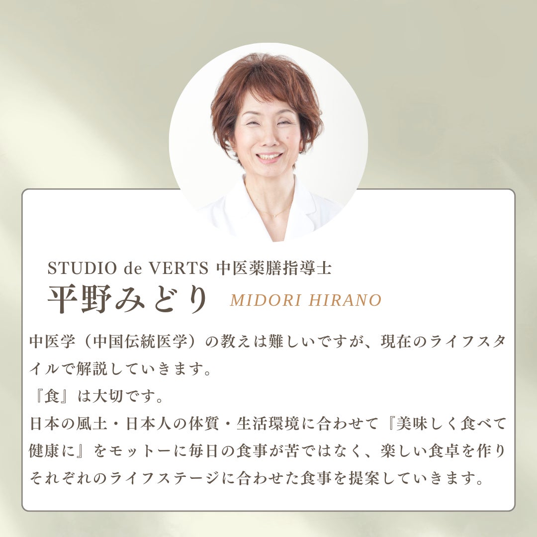 大阪・淀屋橋でエステサロン「STUDIO de VERTS」を営みながら、薬膳の魅力をお伝えしています。