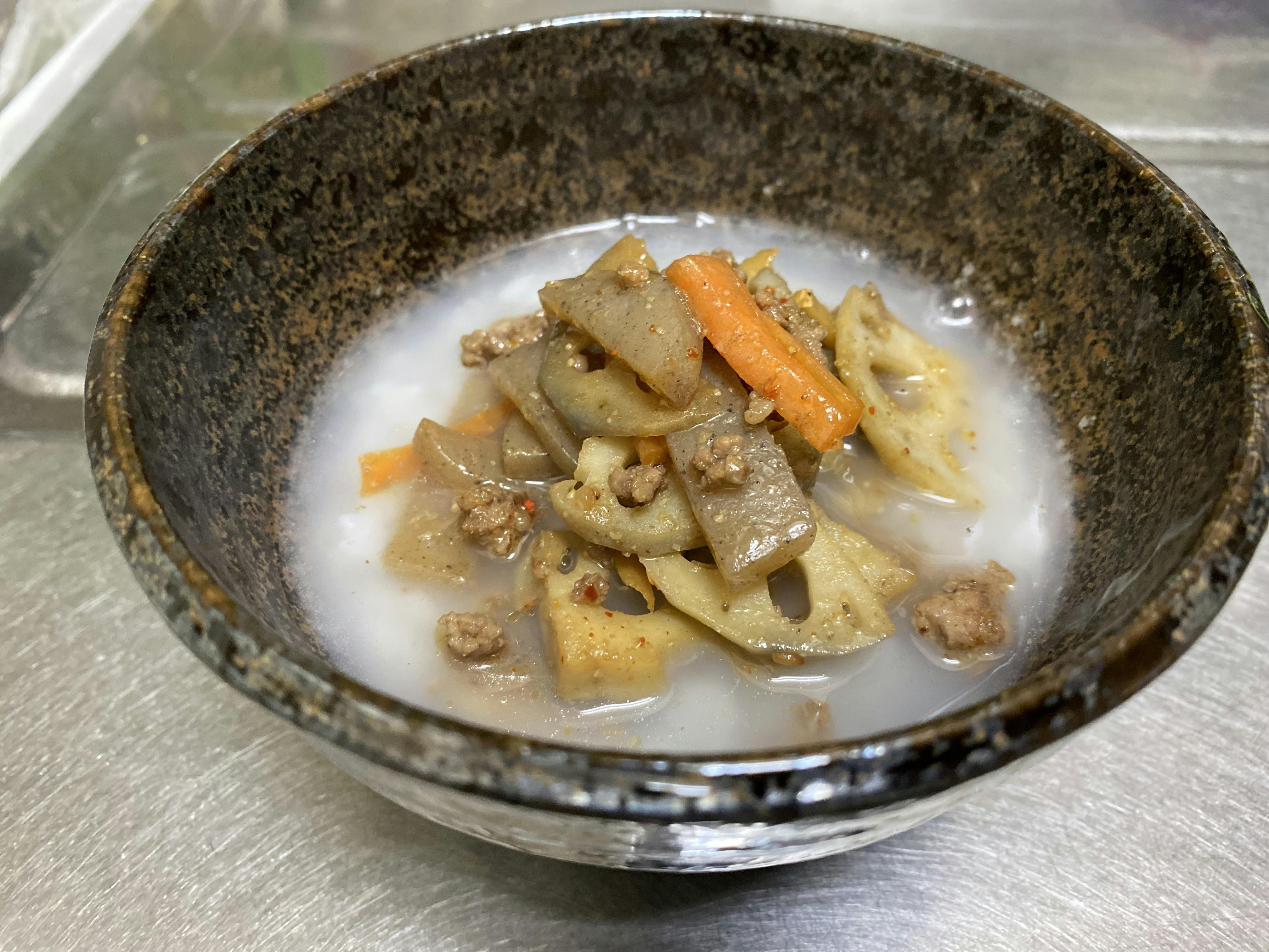 「粥有十利(しゅくゆうじり)」とは…お粥(おかゆ)には十の優れた効用があるという意味の言葉で、仏教の経典のひとつ『大智度論(だいちどろん)』に記されています。古くから、体にやさしい食事としてお粥が重宝されてきた理由が、この「粥有十利」によって語られています。粥有十利の内容1.色(しき)を増す 顔色や肌つやをよくする。2.力を増す 体に力がつき、元気が出る。3.寿(じゅ)を延ばす 健康的に長生きできる。4.楽(らく)を成す 体の調子がよくなり、快適に過ごせる。5.詞清弁(ししょうべん) 言葉が明瞭になり、話しやすくなる。6.宿食を消す(しゅくじきをけす) 胃腸に残った未消化物を排出しやすくする。7.風除(ふうじょ)す 風邪や邪気を防ぐ。8.飢を除く 空腹を満たす。9.渇を止む 喉の渇きを潤す。10.大小便調適(だいしょうべんちょうてき) 排泄がスムーズになる。~現代的な解釈~~カゼをひいたときや、胃腸が疲れたときに食べることが多い【お粥】…おかゆは日本人にとって、胃腸に優しいことから、体が弱っているときや病後療養中の食べ物『病人食』のイメージが強いと思います。薬膳の考え方では『粥有十利=十徳』と呼ばれる効果・効能があるとされ、薬膳の本場である中国・香港・台湾では1日のエネルギーをチャージする朝の定番メニューとして親しまれています。とくに中医学や薬膳でも、「お粥」は養生食の代表格。お粥は、米と水をじっくり煮て作るため、消化吸収がよく、体の中を温め、脾胃(胃腸)をいたわる効果があるとされます。『蓮根キンピラのせ粥』◇材料=お粥(2人前)◇米 半合 (80g~100g)水 800㏄塩 小さじ1/2※蓮根の節(藕節=ぐうせつ)◇材料=蓮根キンピラ(4人前)◇合いびきミンチ肉 90g(醤油麹 大さじ1漬け込む10分程度)蓮根 300gこんにゃく 半丁にんじん 25g生姜(スライス千切り) 3~4枚米油 大さじ1◇材料=蓮根キンピラ調味料◇砂糖 大さじ2+1/2しょう油 大さじ1酒 大さじ1みりん 大さじ1ごま油 大さじ1白ごま 適宜一味唐辛子 適宜 ◆蓮根の効能: 五性:(生)寒性(加熱)微温 蓮根は加熱することで作用が変わります。 (生)の蓮根には口や喉の渇きを潤し、咳や痰を鎮めます。 また、鼻血などの止血作用もあります。 (加熱した)蓮根には消化器系の働きを高め、食欲不振や下痢を 抑える働きがあります。 また、血を補い、美しい肌を作り効果もあります。※レンコン入りのお粥「藕粥」は中国古代の薬膳粥で、長く続ければ 健康で長生きできるとされています。※スーパーで蓮根の節(藕節=ぐうせつ)見つけたのでお粥と一緒に炊きました! 硬いので食べられないけど、一緒に煮込むことで効能が増します!※蓮根キンピラは、余ったらお弁当のおかずや晩酌のおともに…どうぞ!*美薬膳粥と薬膳スープ 第3木曜日 20:00~20:45 オンライン講座:https://forms.gle/CRxcApcg7uesPRBd6