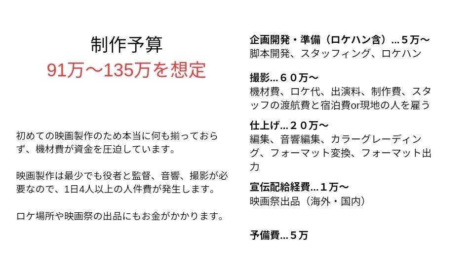 それどころか、映画制作には撮影機材のレンタル費用、ロケ地の確保、スタッフやキャストのギャラなど、多くの資金が必要です。初監督作品なので、自分で揃えなければならない機材費が本当に大きな負担になっています。これらを自力で賄うことは非常に困難と判断し、制作費の30%程を皆様からご支援いただけないかと思い、クラウドファンディングに踏み切りました。