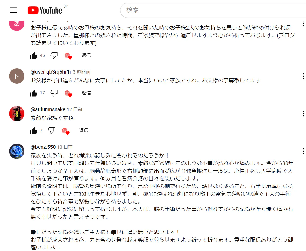 YouTubeチャンネルには多くのコメントが寄せられています。