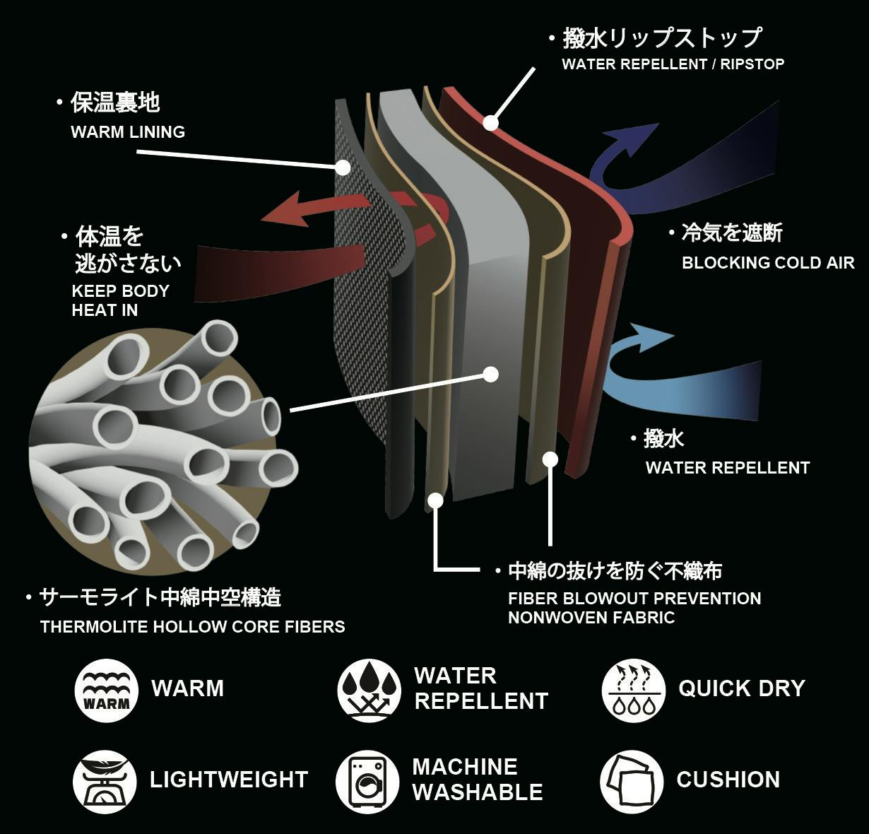 優れた保温性を持つインビスタ社のサーモライト中綿は、機能性が求められるスポーツ・アウトドア分野で数多くのアウターや寝袋を中心に使用されてきました。独自の繊維構造により暖かく快適さを提供する軽量保温素材です。