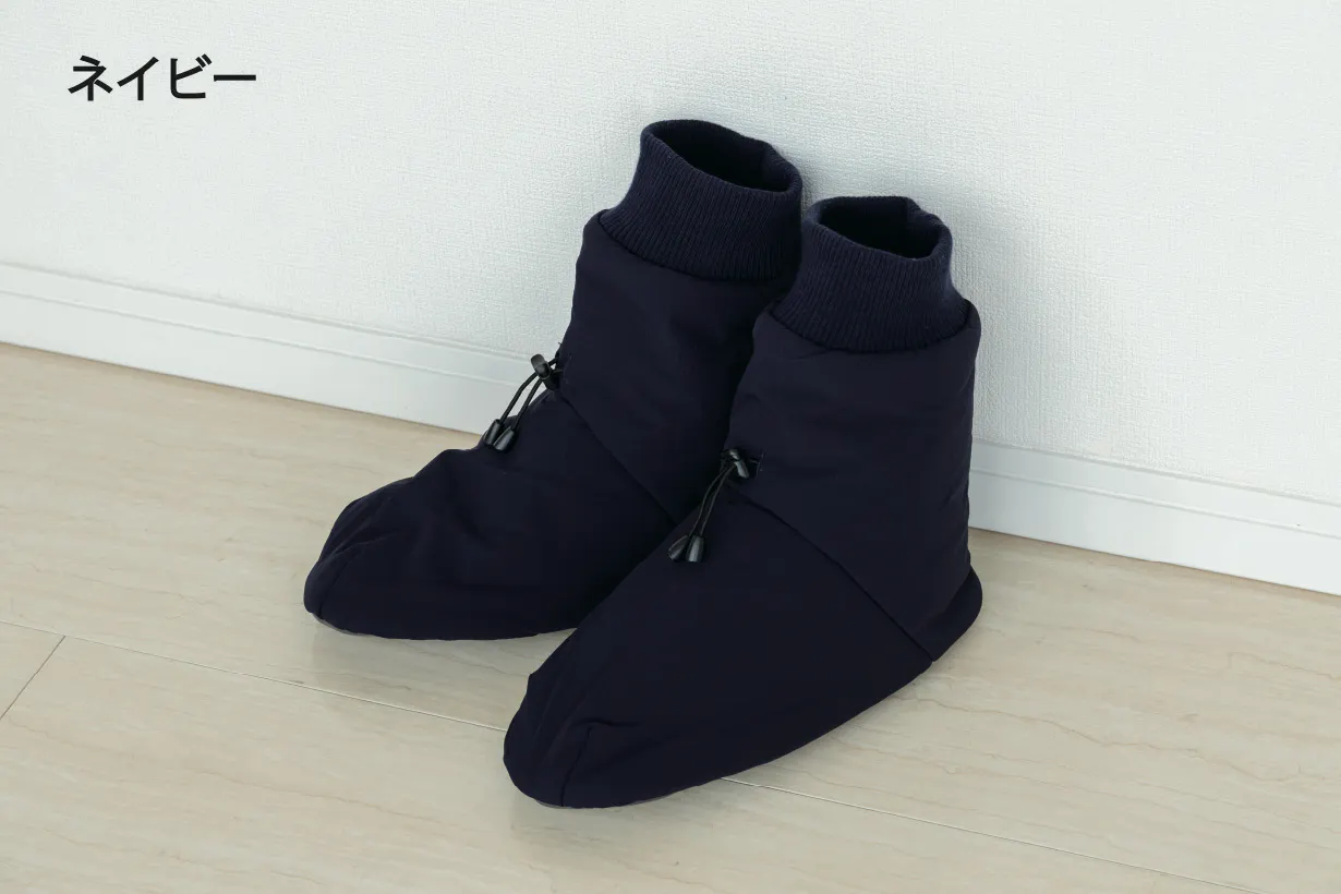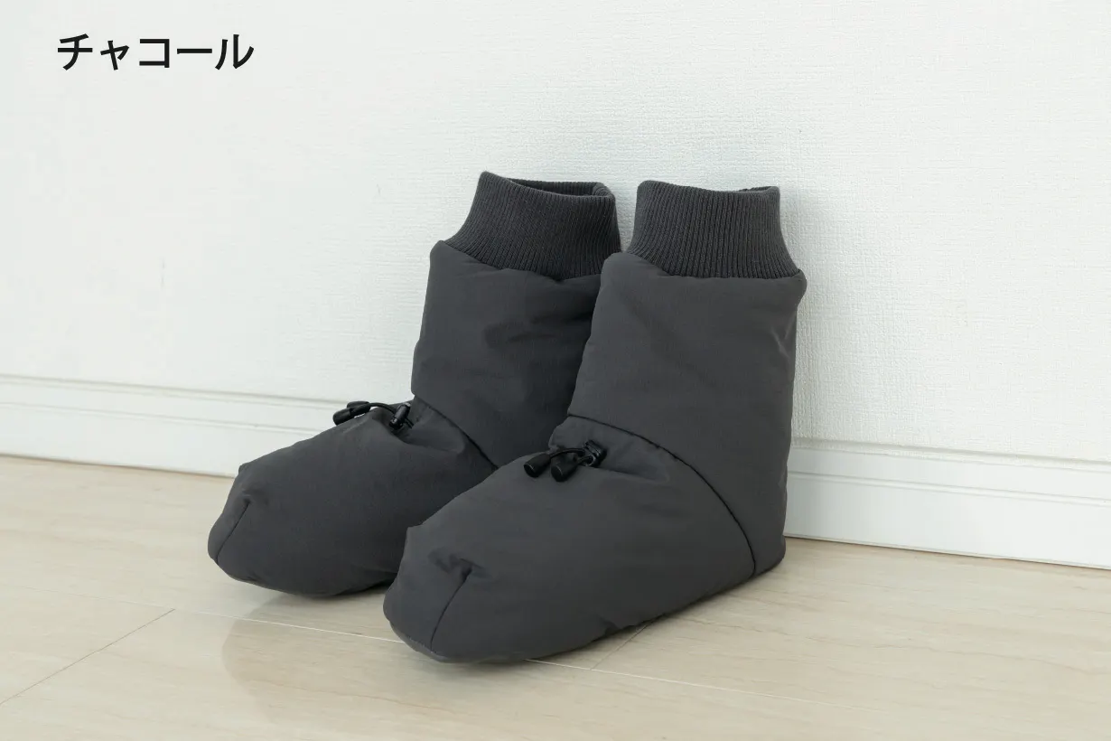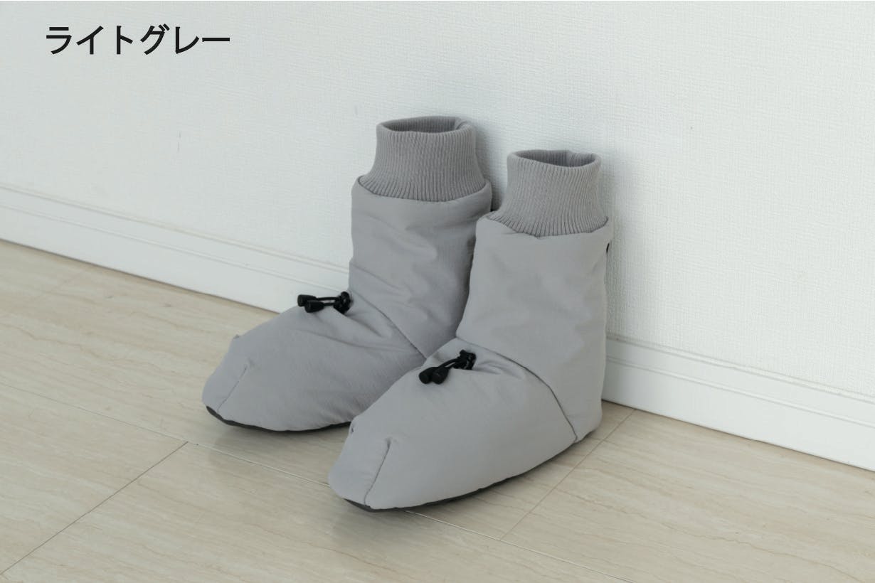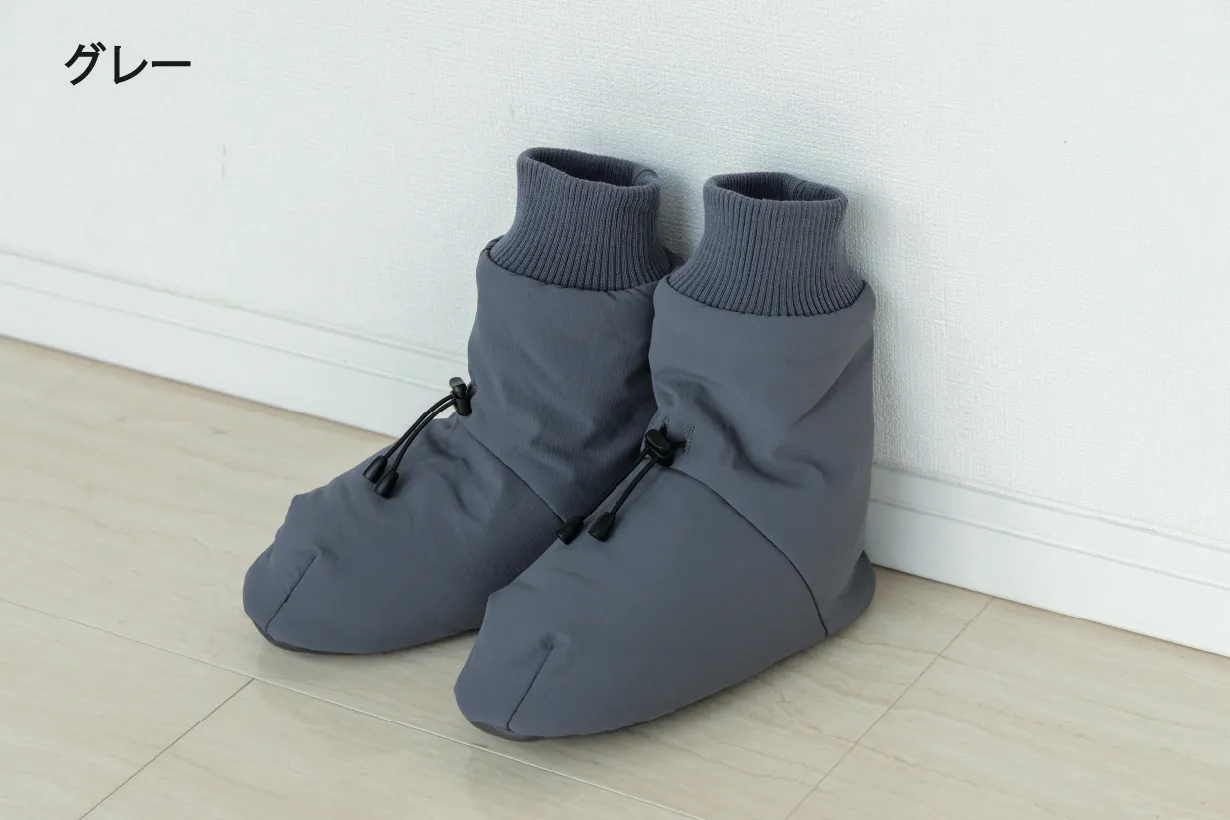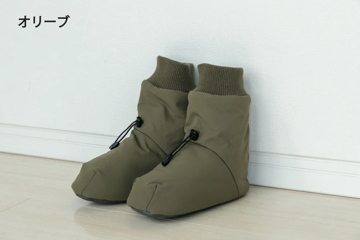 アウトドアではテントの中で足先を暖めるテントシューズが一般的ですが、もっと楽に履けるよう靴下風のデザインになっています。モモンガと同じ5層構造ですが、中綿分量はモモンガより厚手のサーモライト中綿を使用し、裏地は保温裏地を使っています。内底はボアで暖かく、外底はフェイクレザーで滑りにくくなっています。(外履き用ではありません。テント内や室内でご使用ください。)