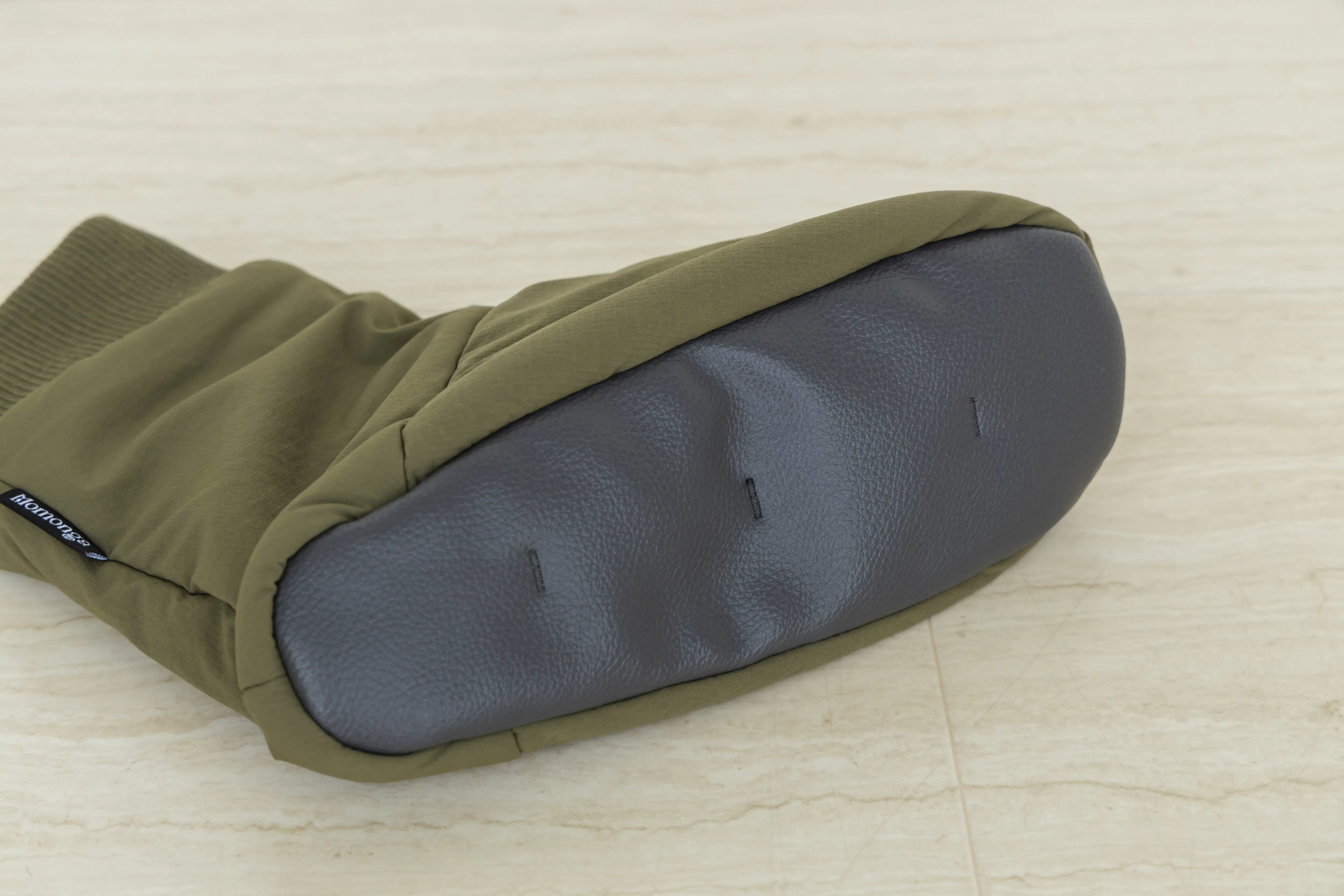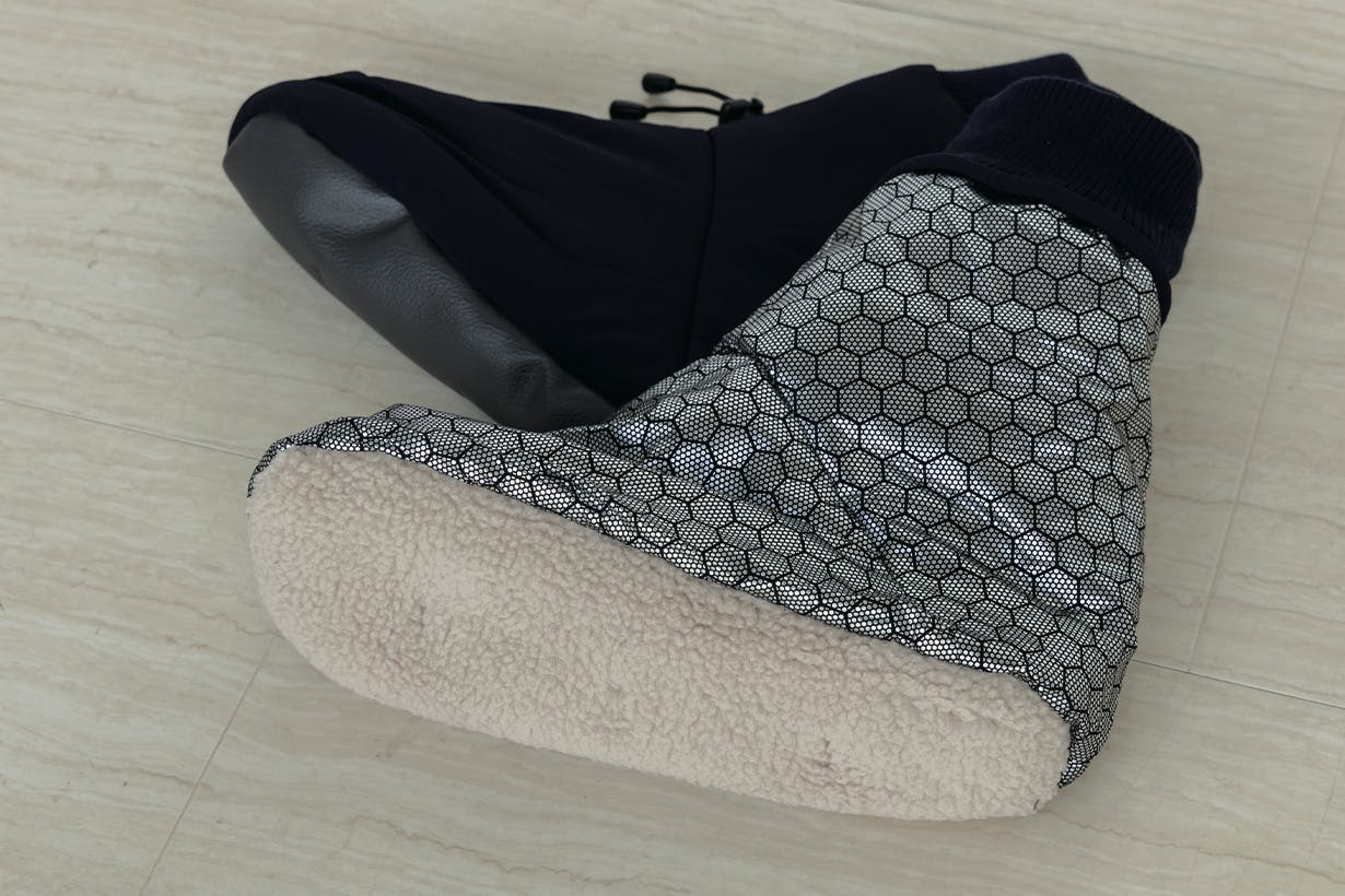 モモンガ本体と同じ保温裏地を使っています。内底にはボアを使っているので履いた瞬間から暖かく、外底はフェイクレザーで滑りにくくなっています。足底にはかんぬき止めステッチを施し、歩くときの生地のズレを防止しています。