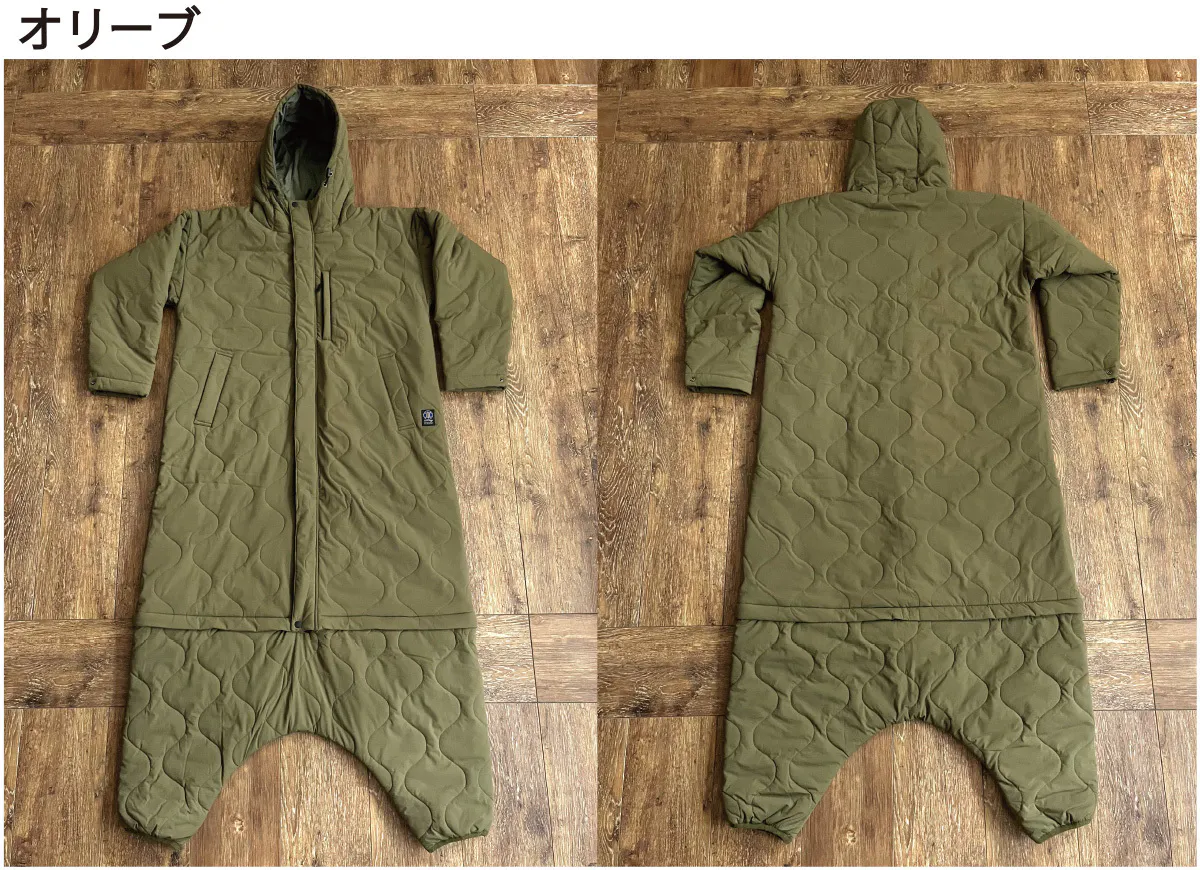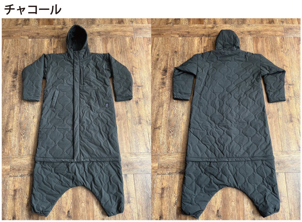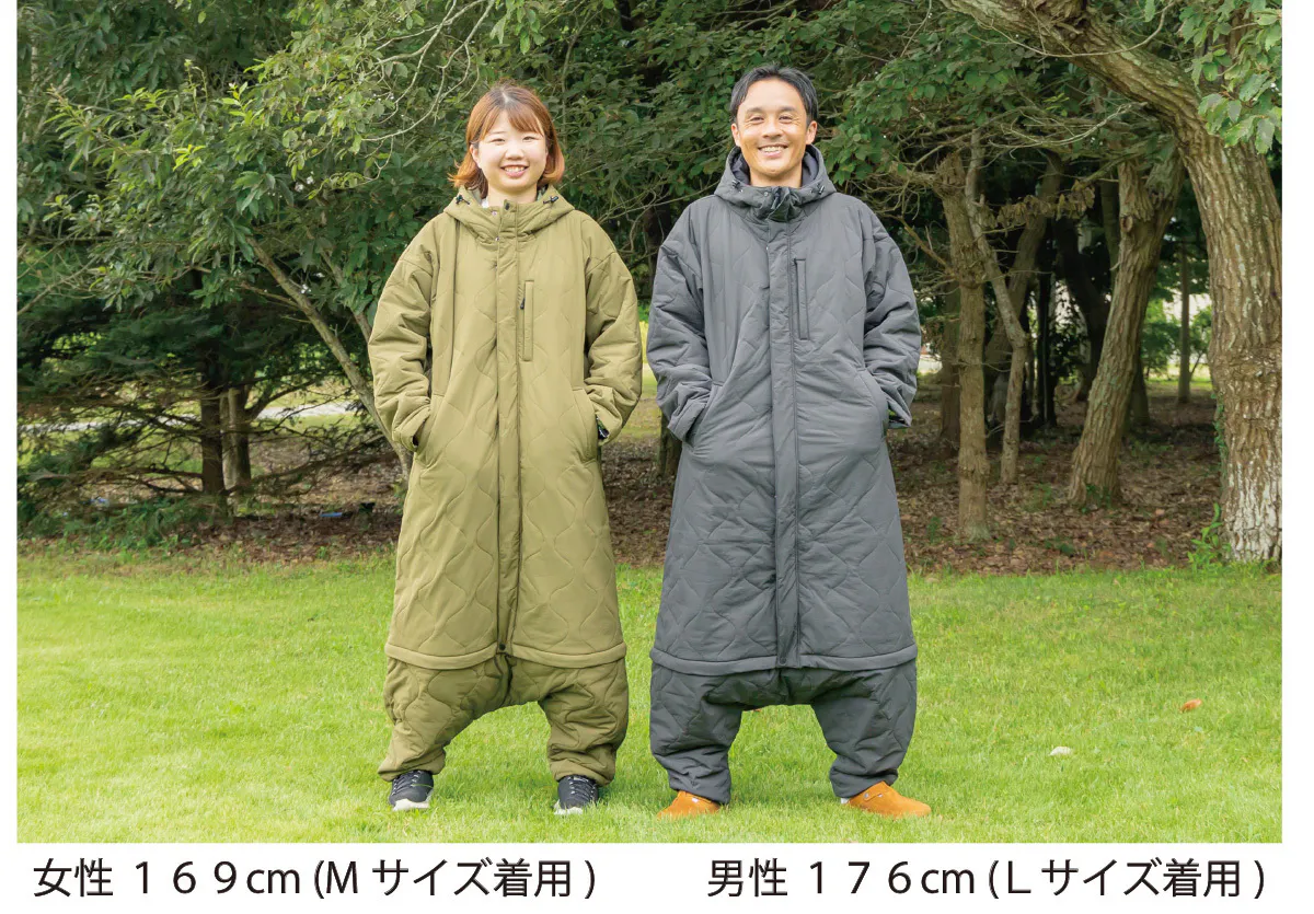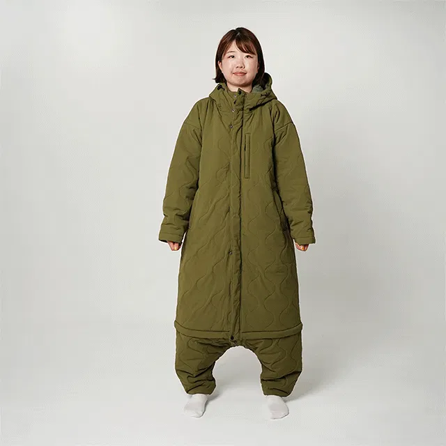 封筒型寝袋から派生したデザインはロングスカートでもスーツでもそのまま上に重ねて簡単に着用できます。