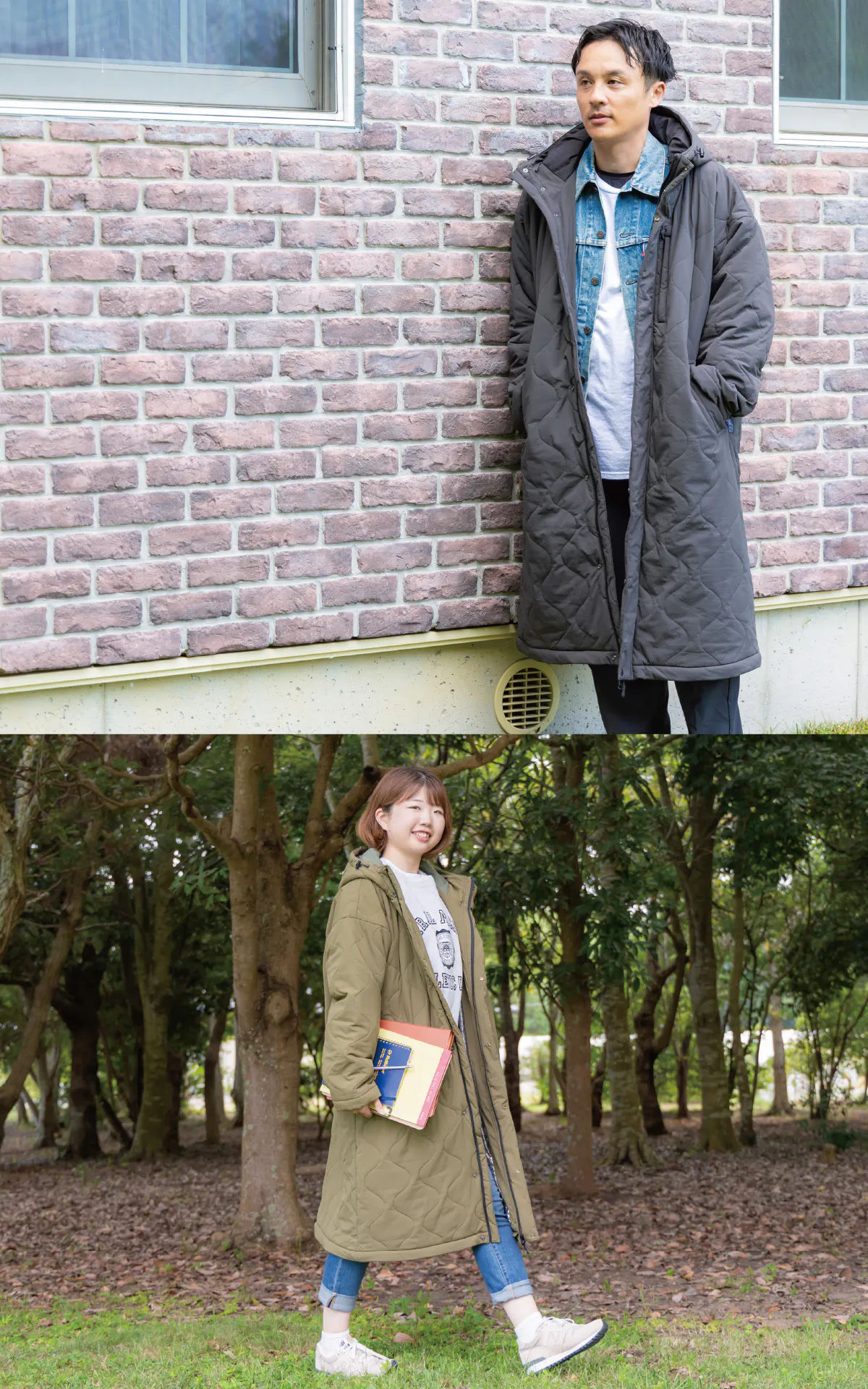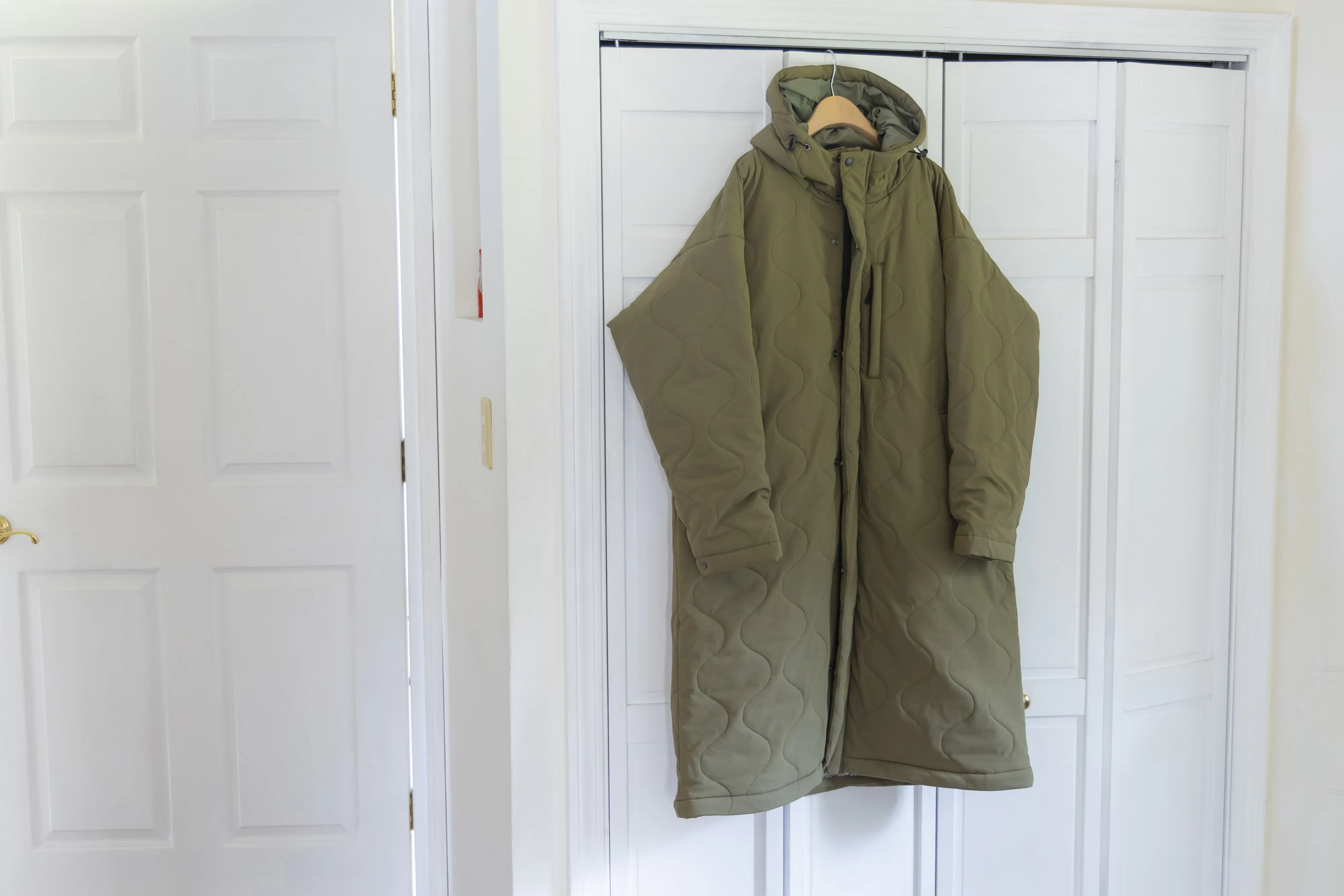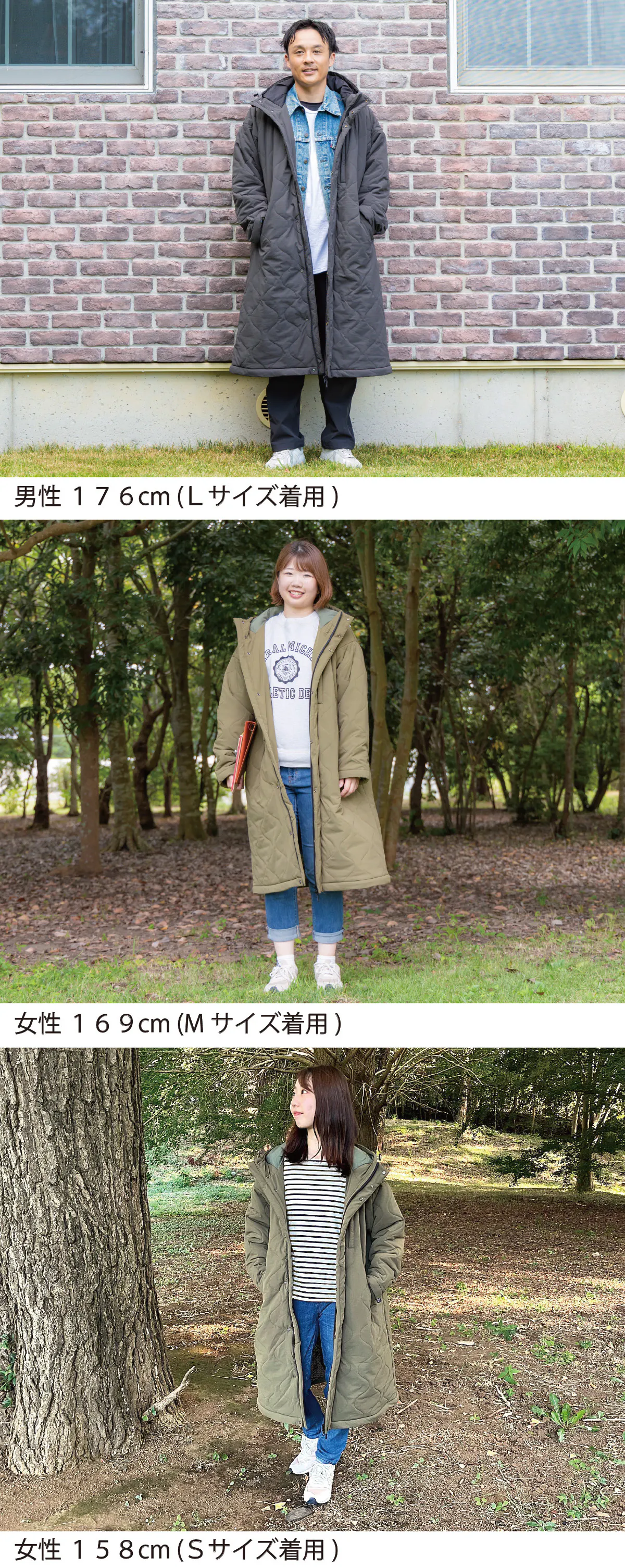 封筒型寝袋から派生したデザインはロングスカートでもスーツでもそのまま上に重ねて簡単に着用できます。
