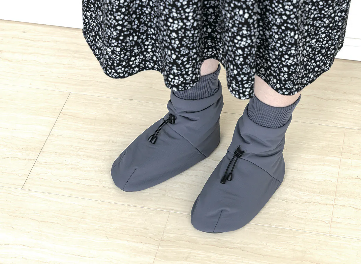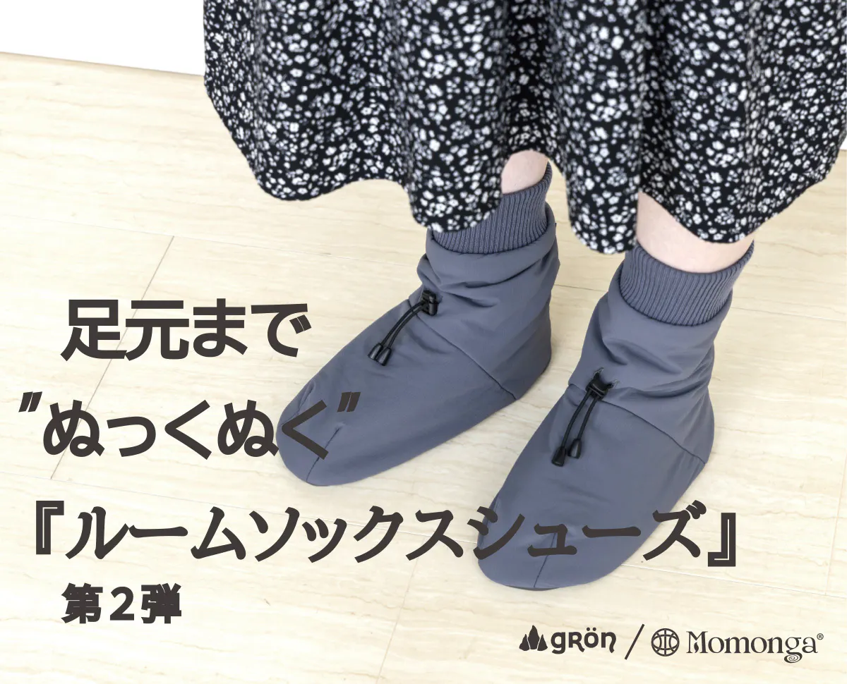 昨年誕生した「ルームソックスシューズ」が歩きやすく進化しました。足首部分をドローコードで調節できるようにし、脱げにくくなりました。足底の素材を変更し更に滑りにくくなりました。これまでご購入いただいたモモンガと色を合わせられるよう色展開を増やしました。暖かさは去年と同等です。とてもとても暖かいです。