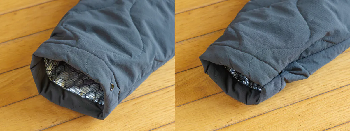 袖口はスナップ釦で調節、足口はニットバインダーで冷気の侵入を防ぎます。