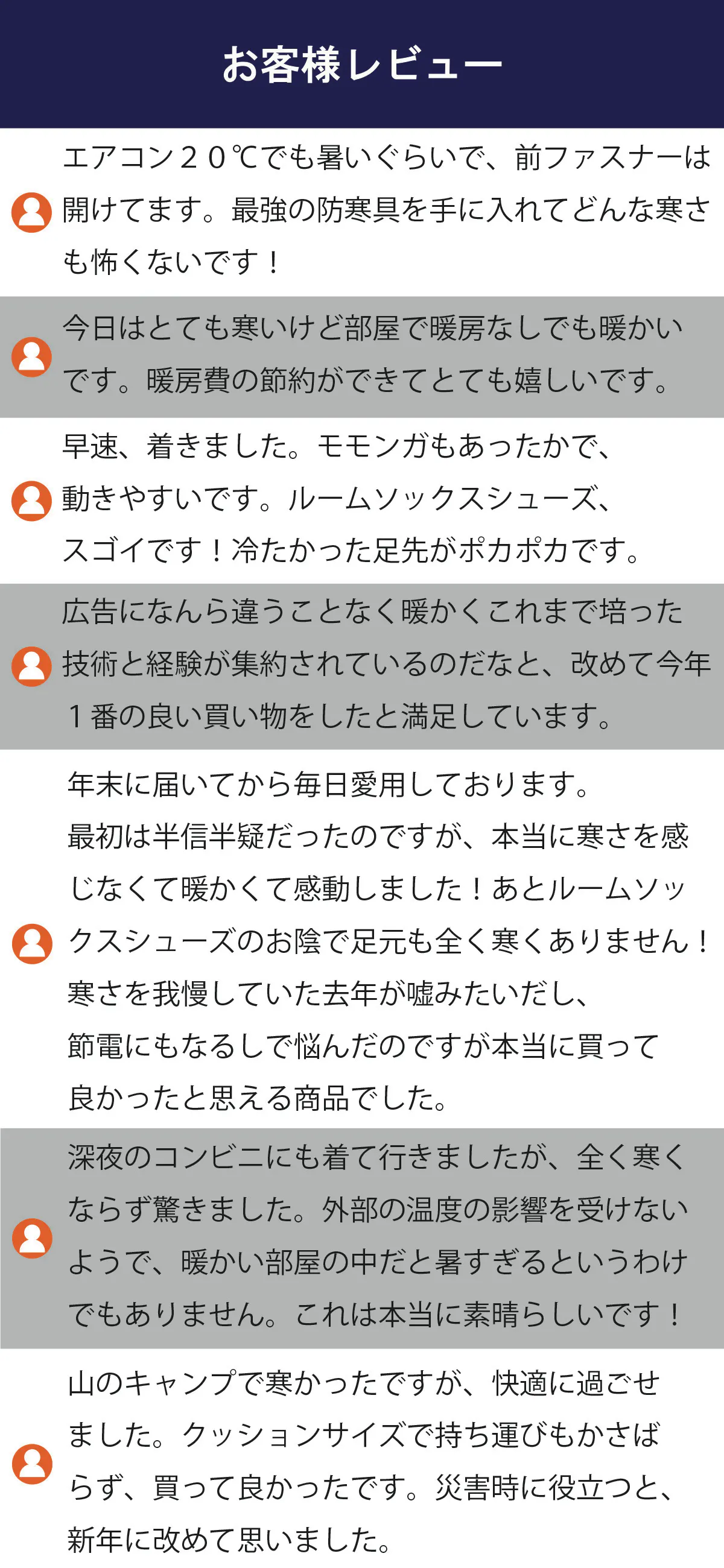 毎年10月から3月頃までの1年の約半分の期間で日本人の約6割、男性約4割、女性約8割の方が寒さにお困りです。寒さを解消することで心まで元気に温めてくれます。