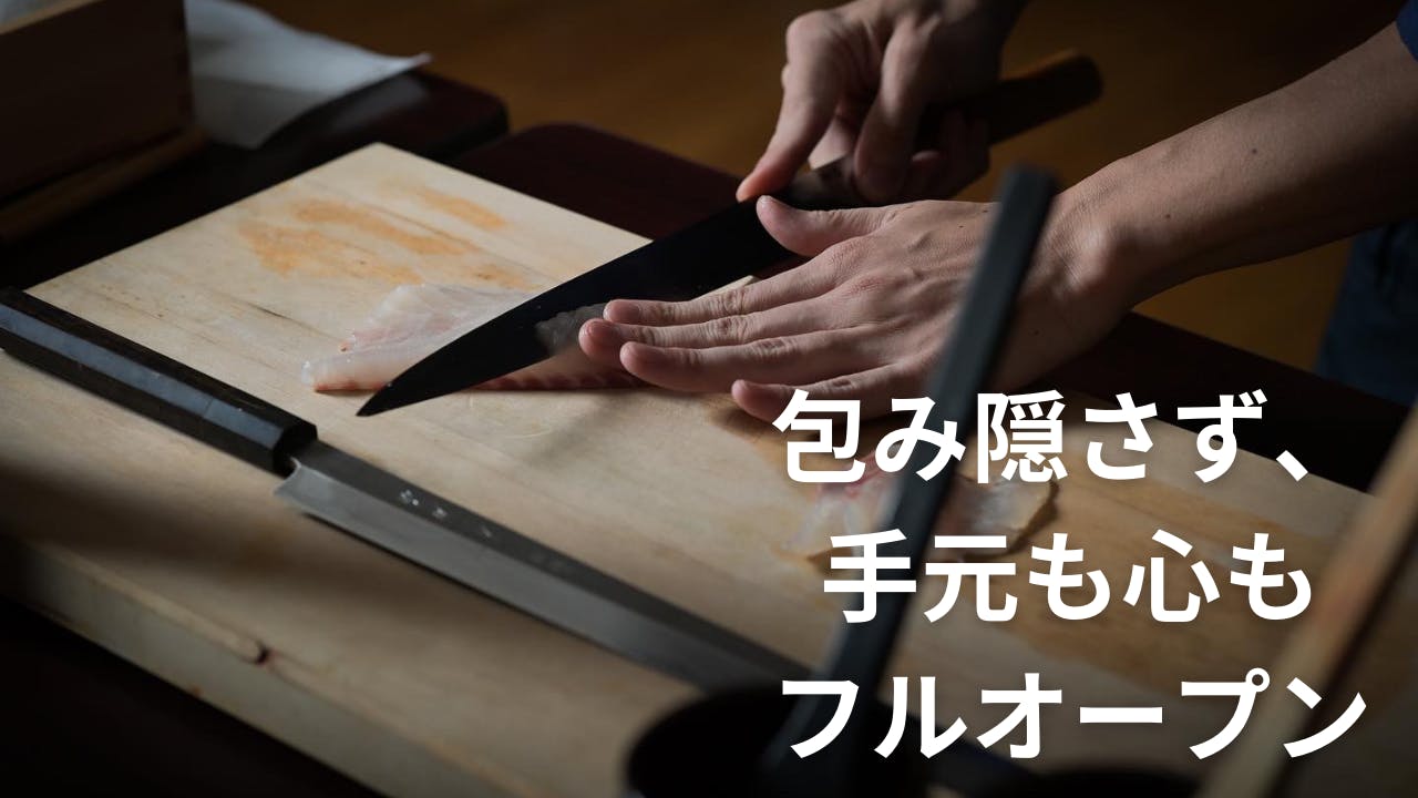 やっていることを包み隠さずお見せするという意味をこめて、あえてお客様の目の前で料理をしています。