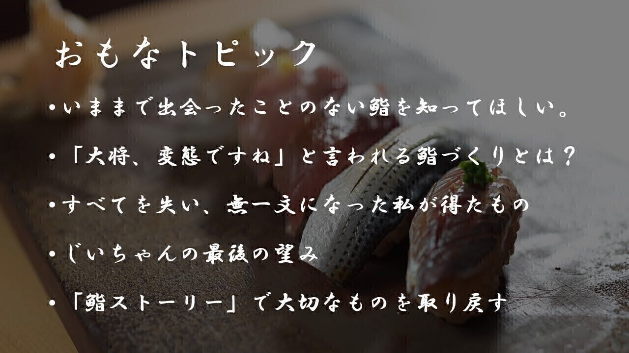 鮨づくり通じて得た経験や知識のほか、欲のかたまりだった自分を変えた格言や人生訓も伝えます。