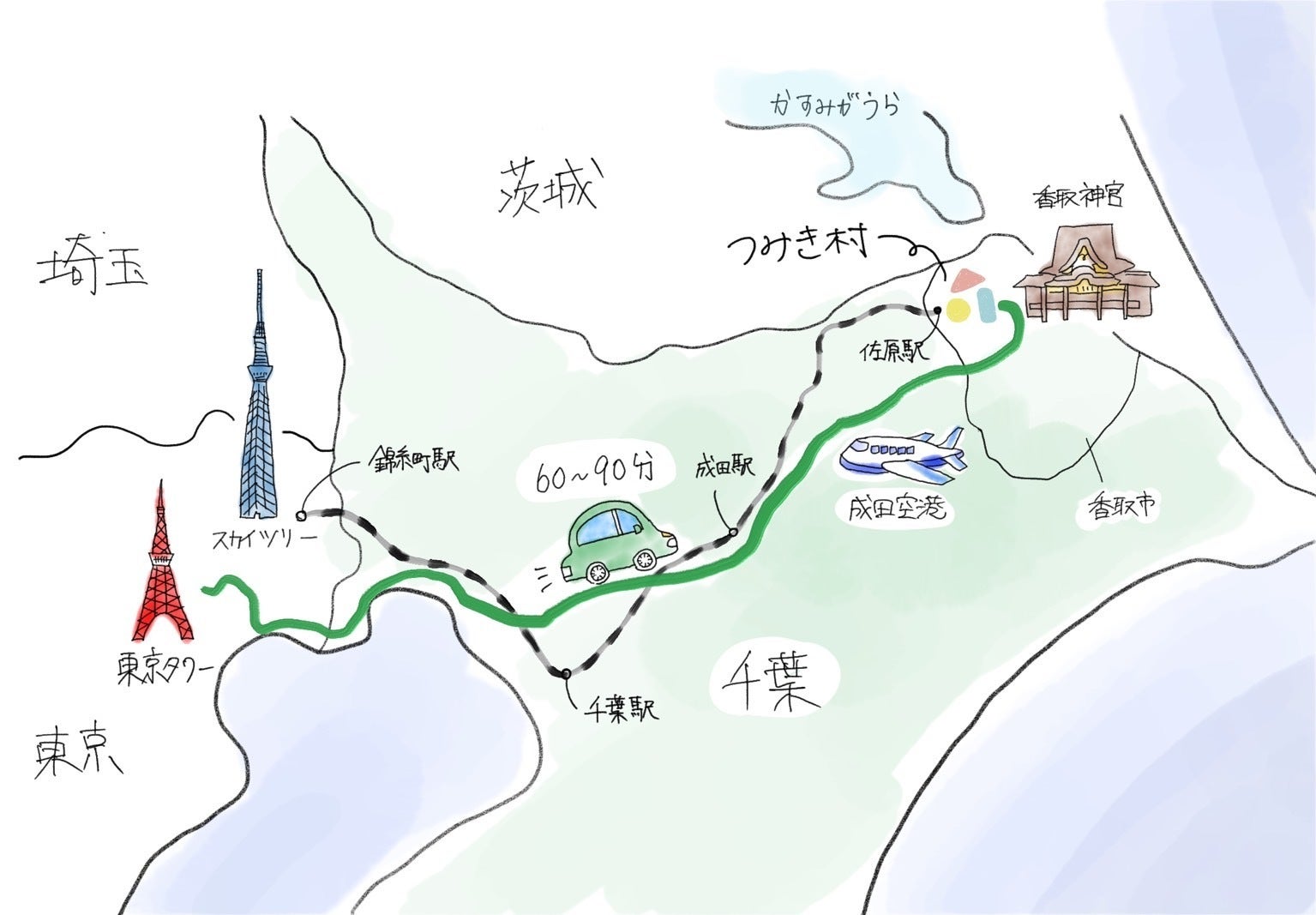 香取市は、都内から車で1時間〜1時間半、成田空港からも30分圏内とアクセス抜群の場所です。電車では「佐原駅」を利用できます。