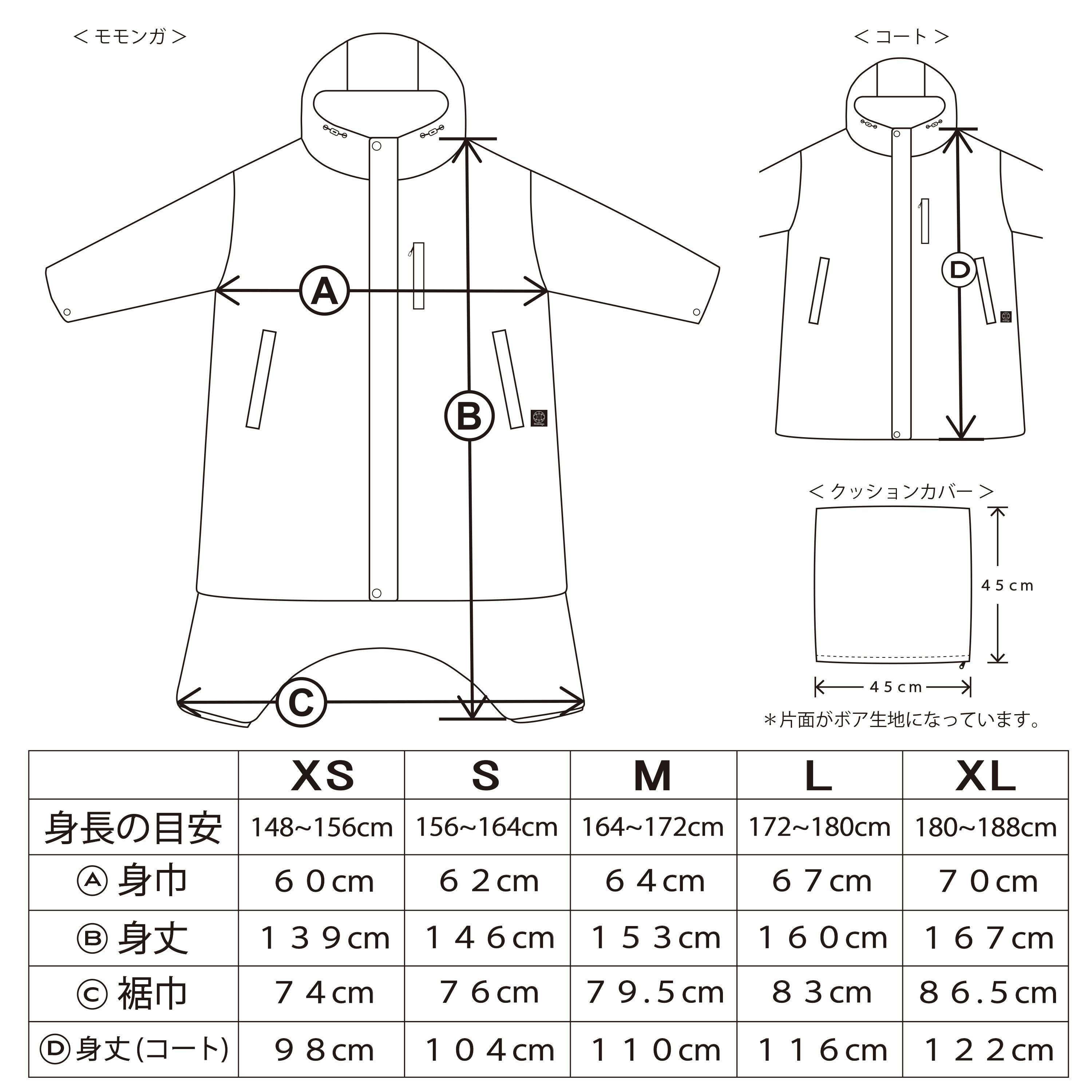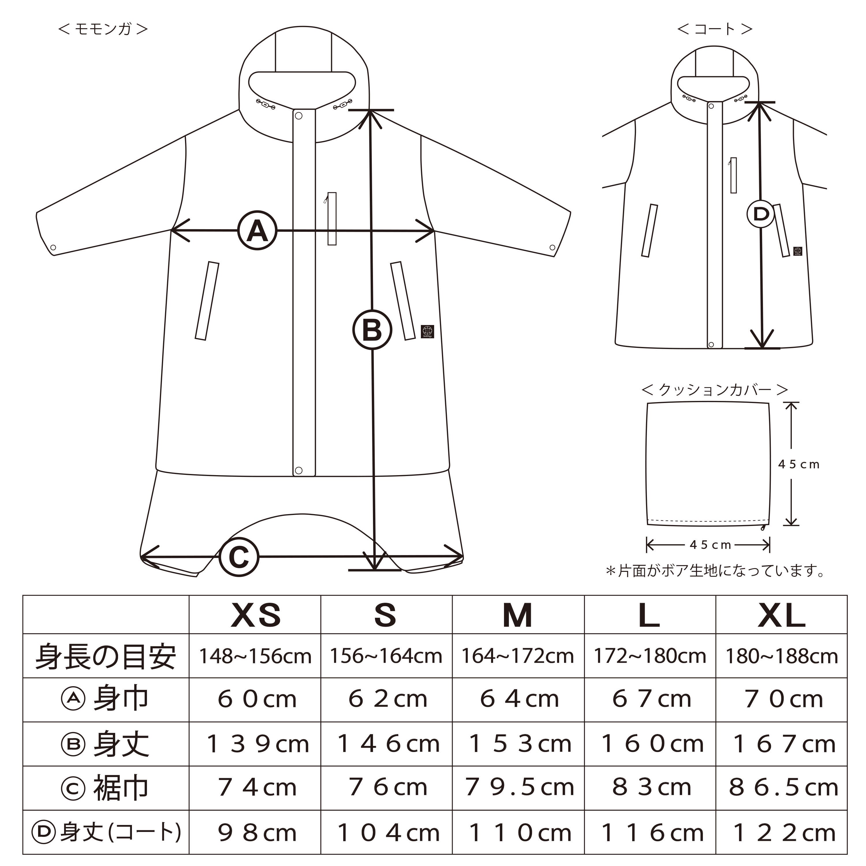 「モモンガ」は私たち全員が持っている37度前後の自然エネルギー・体温を熱源としています。身体とモモンガの間の「被服気候」といわれる空間を体温で暖めた空気で満たすことで、ゆったりと快適で移動してもずっと暖かさに包まれます。
