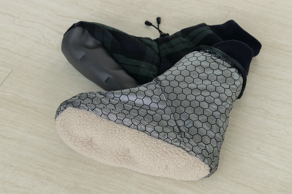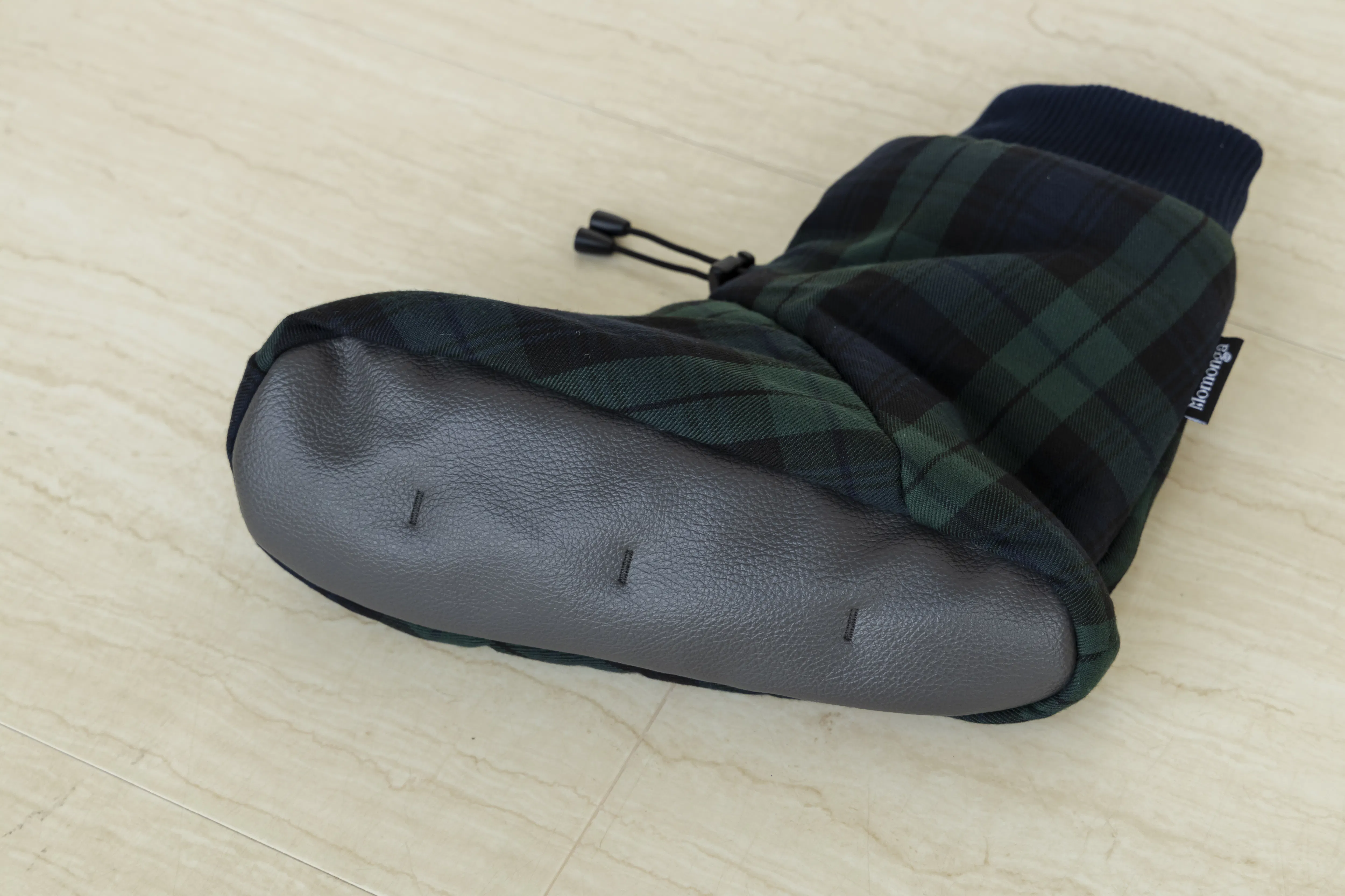 モモンガ本体と同じ保温裏地を使っています。内底にはボアを使っているので履いた瞬間から暖かく、外底はフェイクレザーで滑りにくくなっています。足底にはかんぬき止めステッチを施し、歩くときの生地のズレを防止しています。