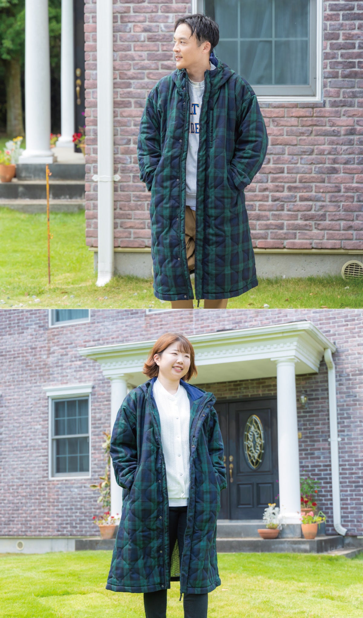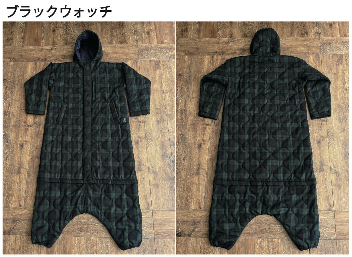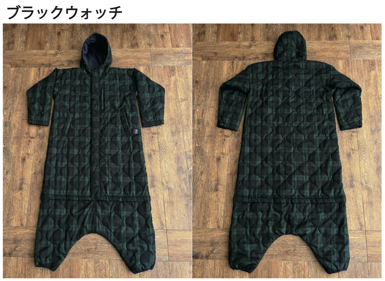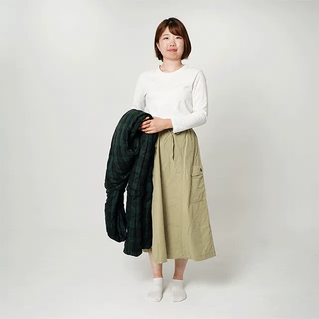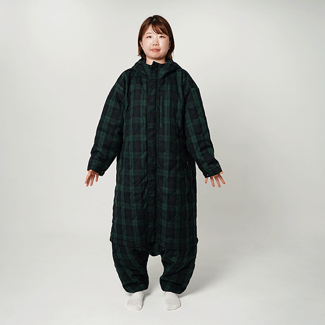 封筒型寝袋から派生したデザインはロングスカートでもスーツでもそのまま上に重ねて簡単に着用できます。