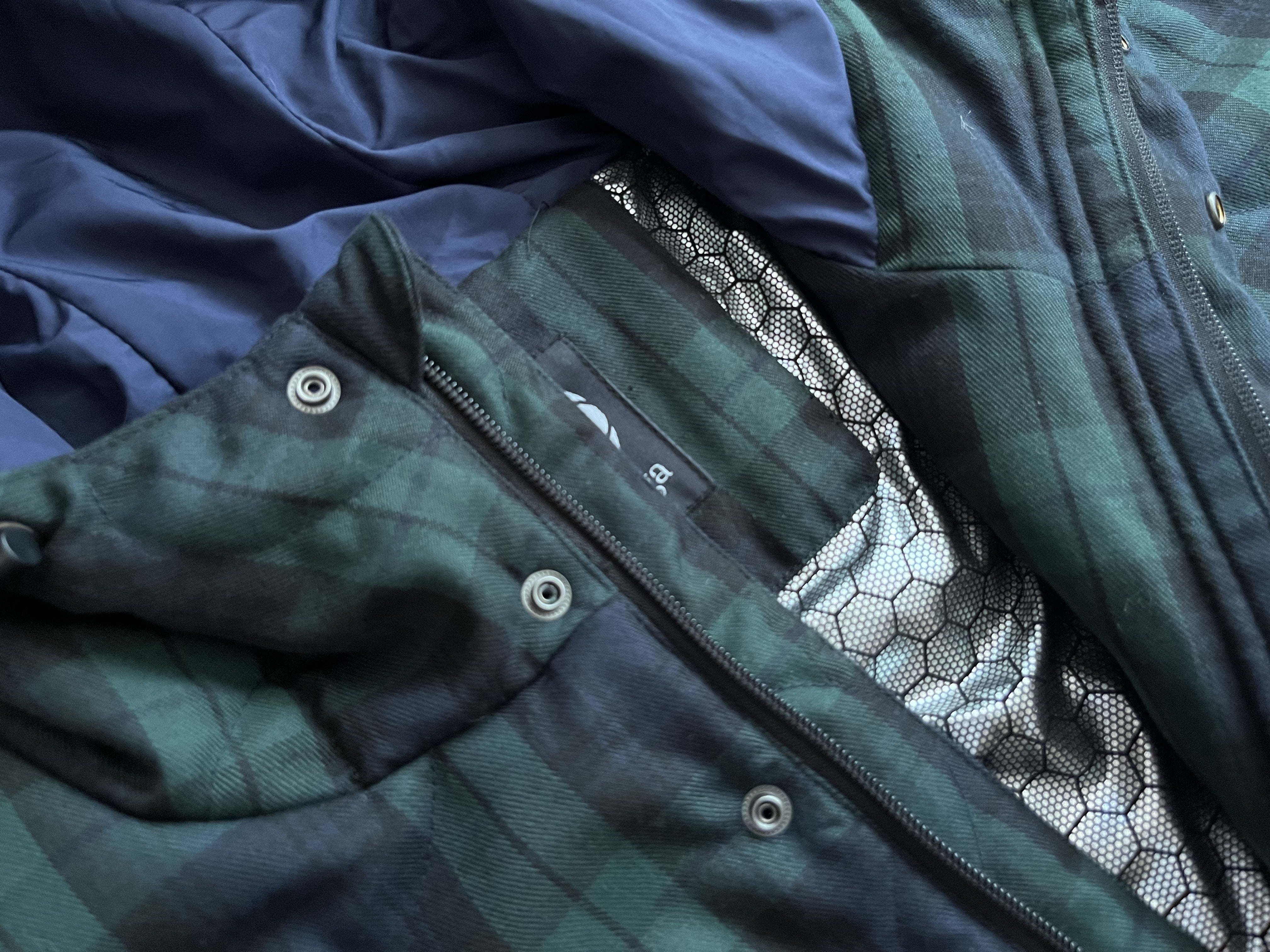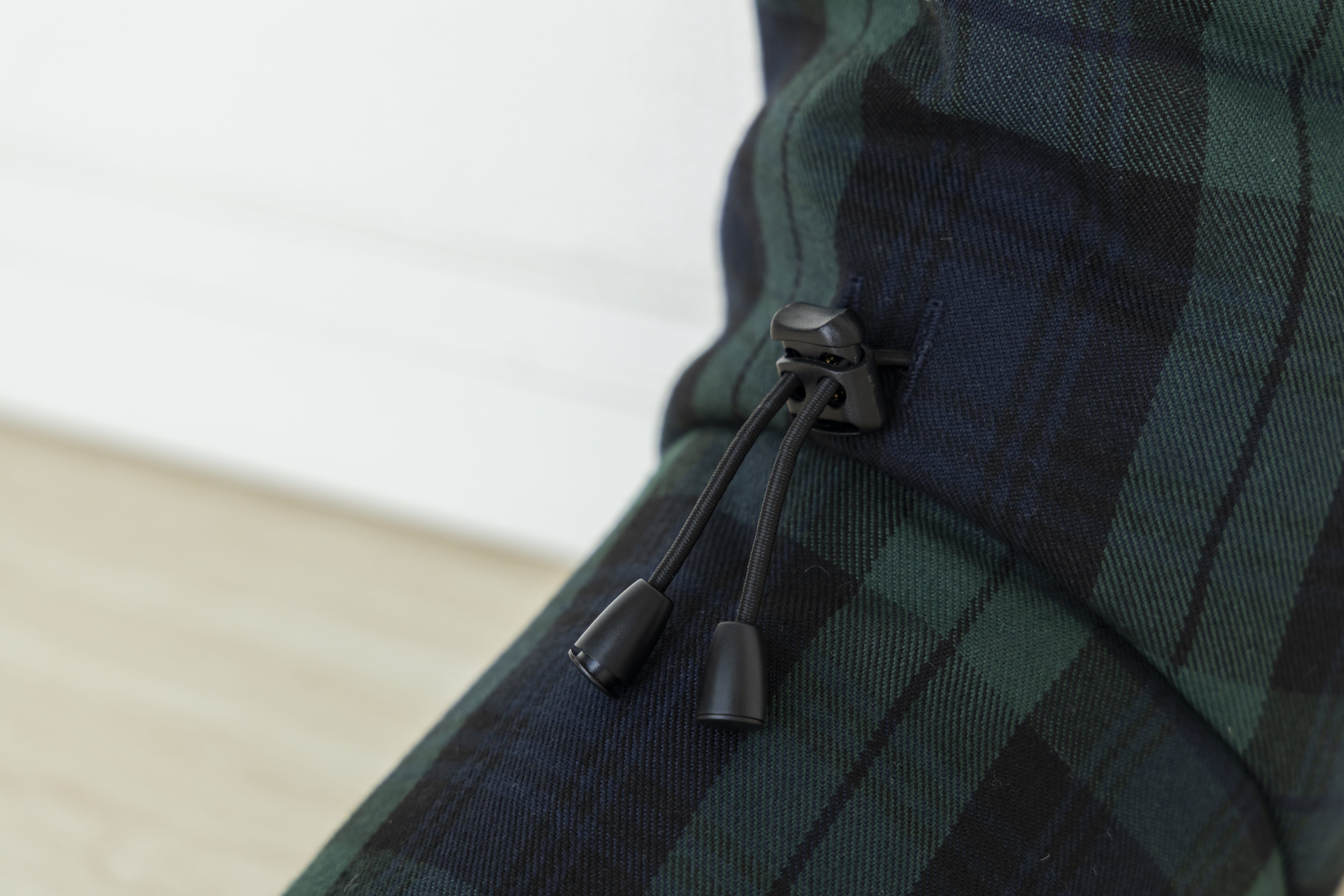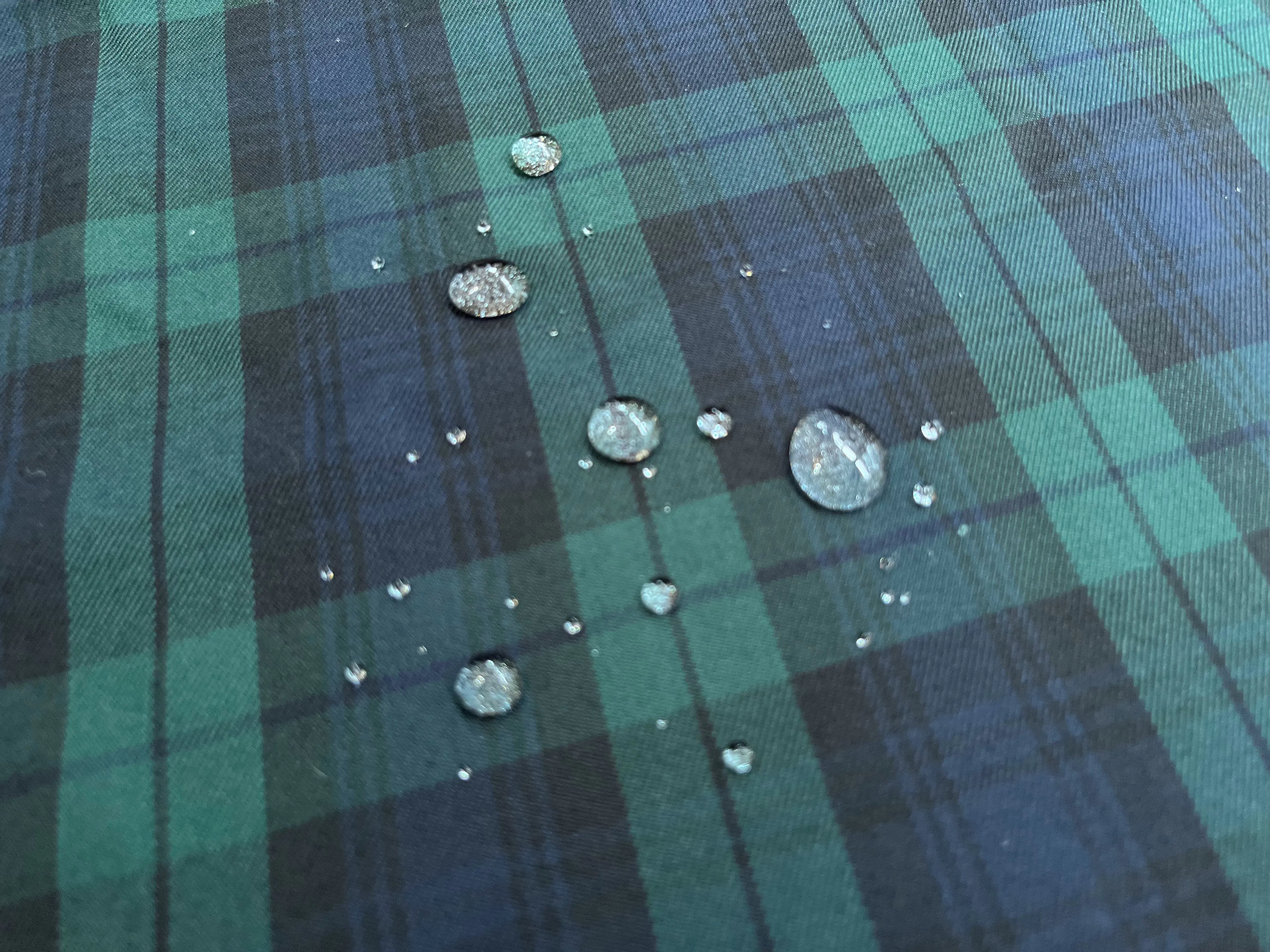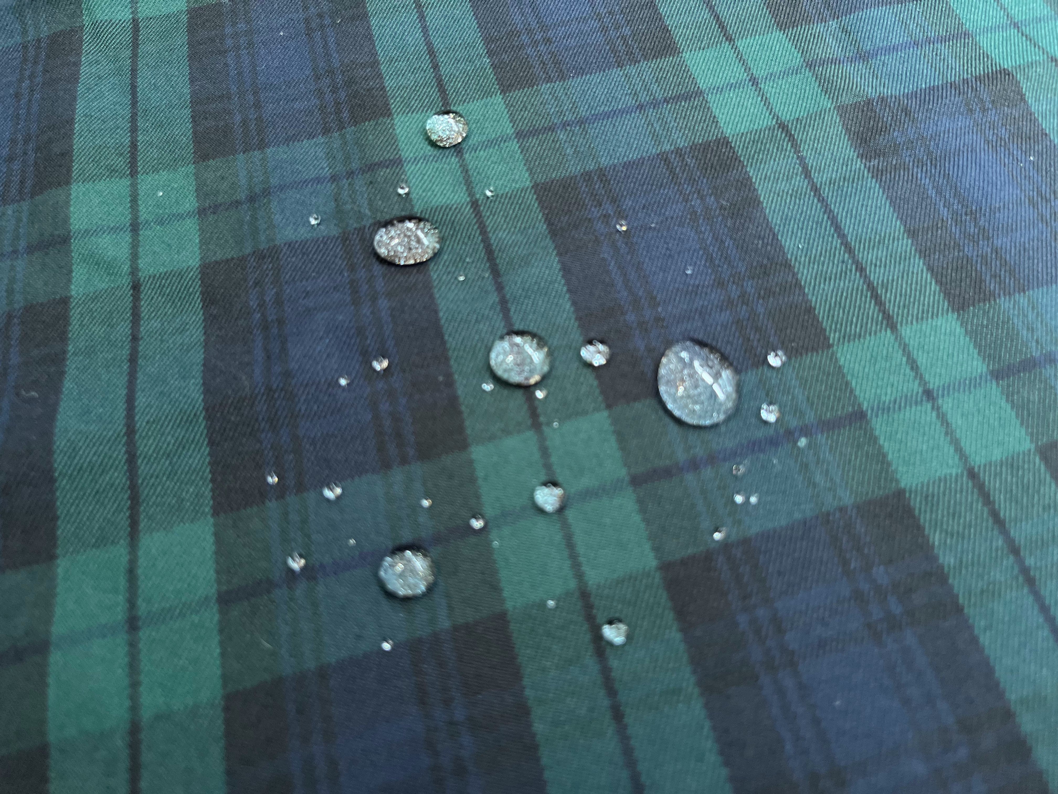 表地にはウールタッチのポリエステルブラックウォッチ生地に撥水加工を施し、水をはじき汚れにくくなっています。肌触りはウールのジャケットのように上品ですが、ポリエステル素材なので丈夫で、洗濯機で洗えてお手入れも楽です。