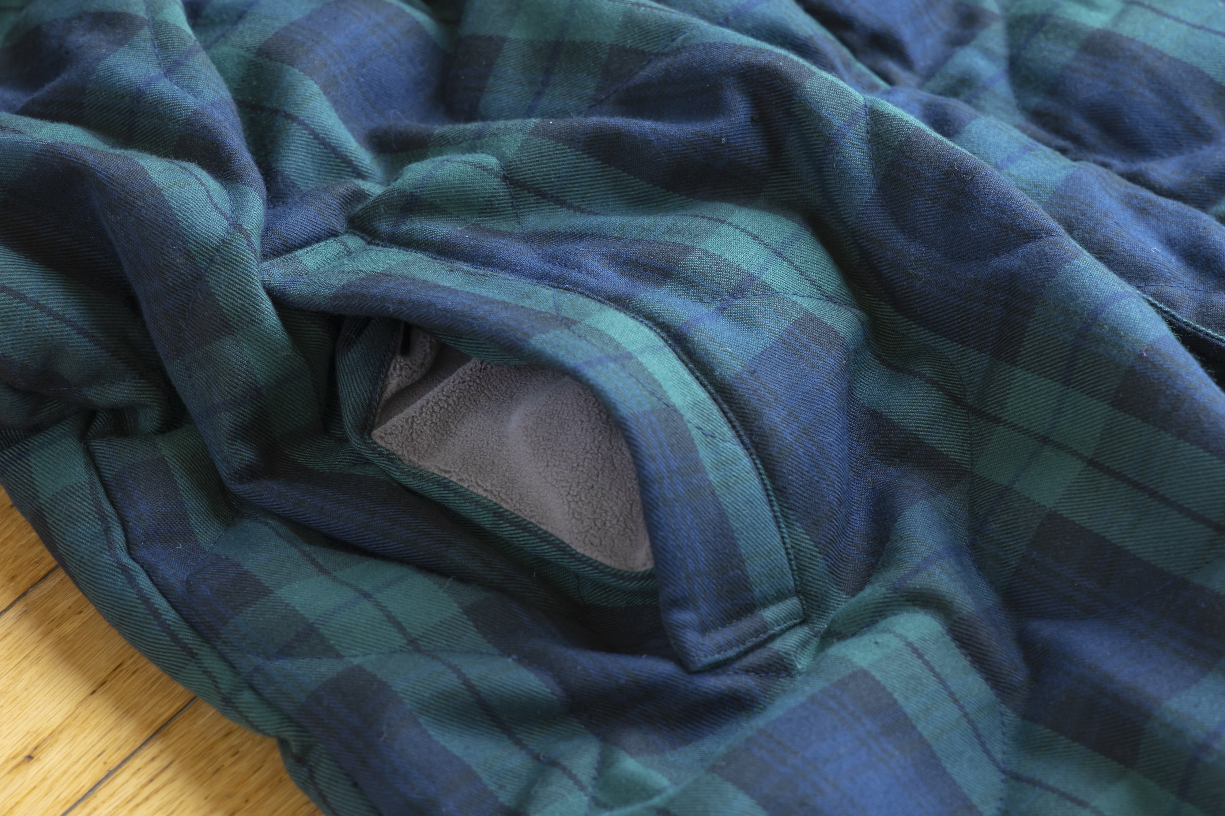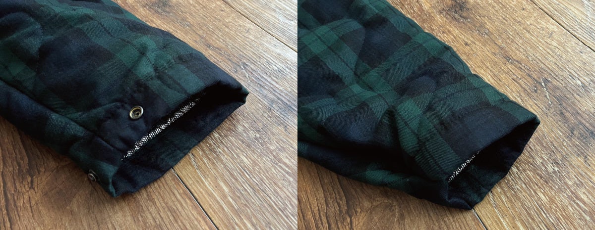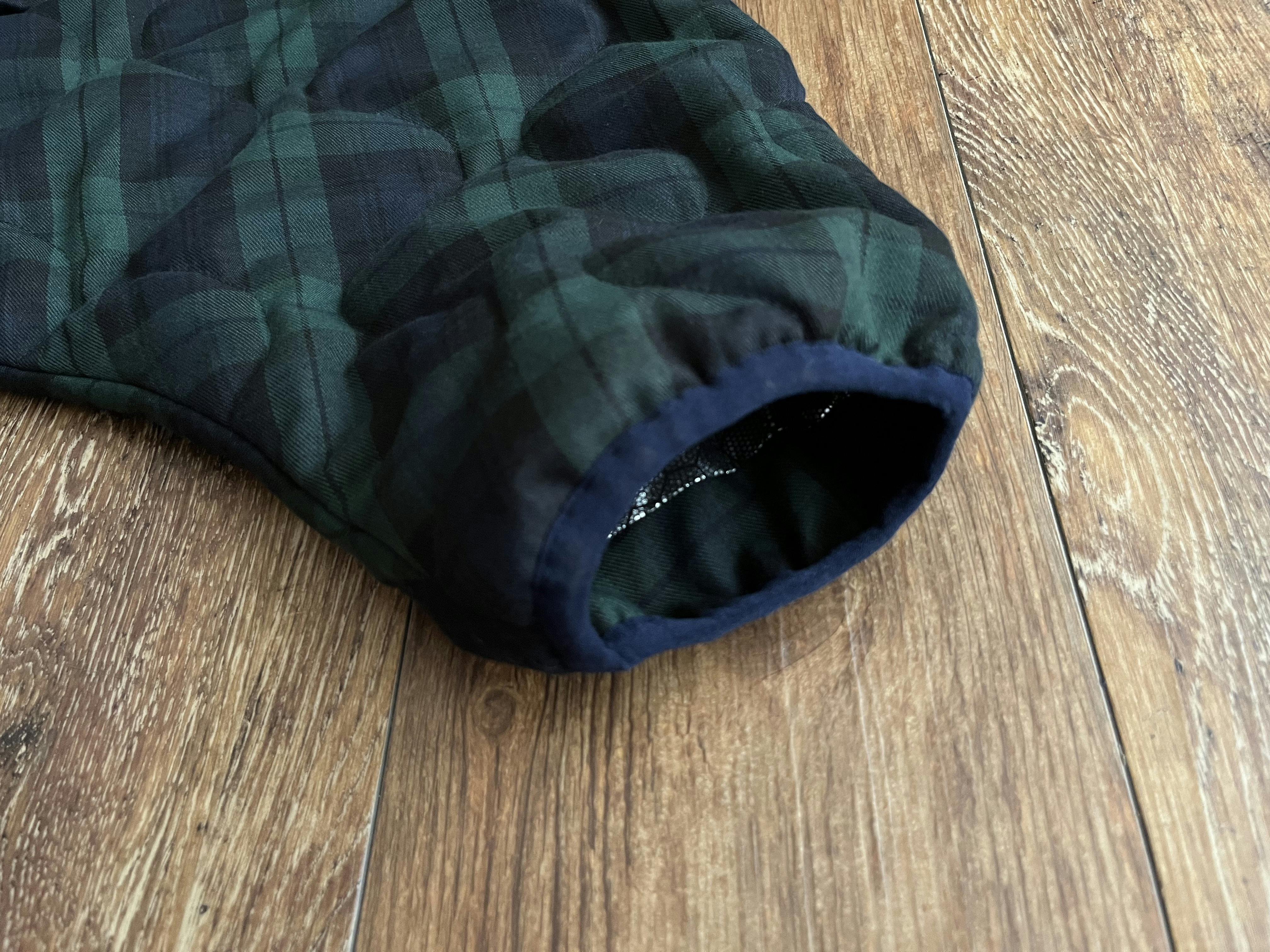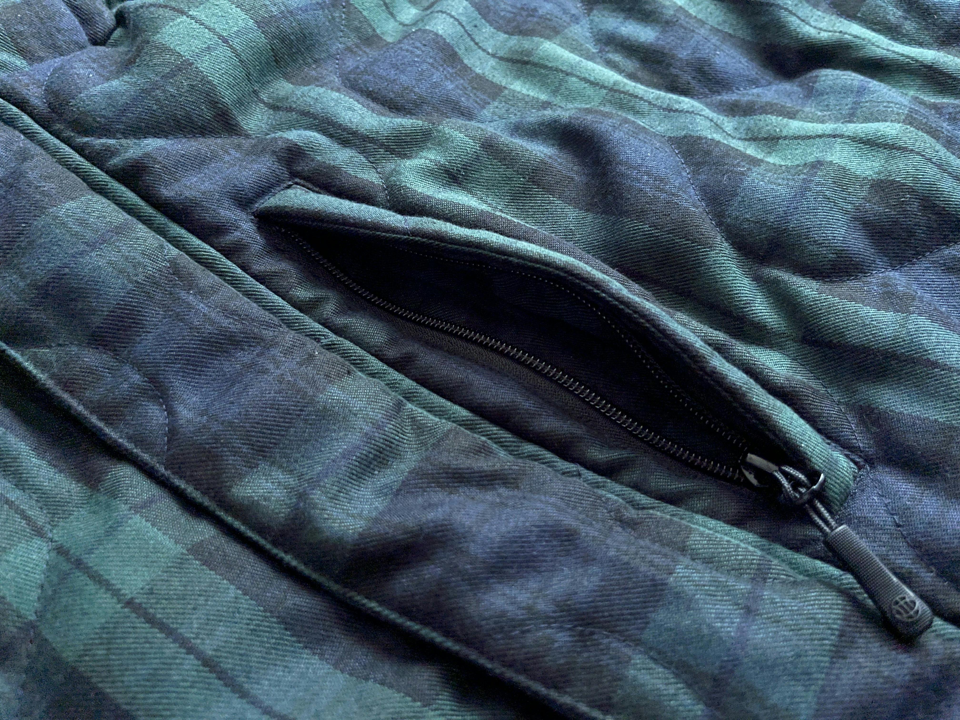 表地にはウールタッチのポリエステルブラックウォッチ生地に撥水加工を施し、水をはじき汚れにくくなっています。肌触りはウールのジャケットのように上品ですが、ポリエステル素材なので丈夫で、洗濯機で洗えてお手入れも楽です。