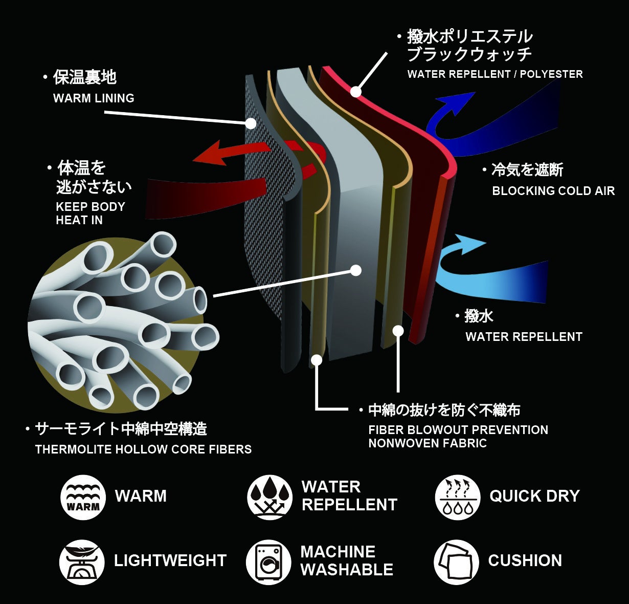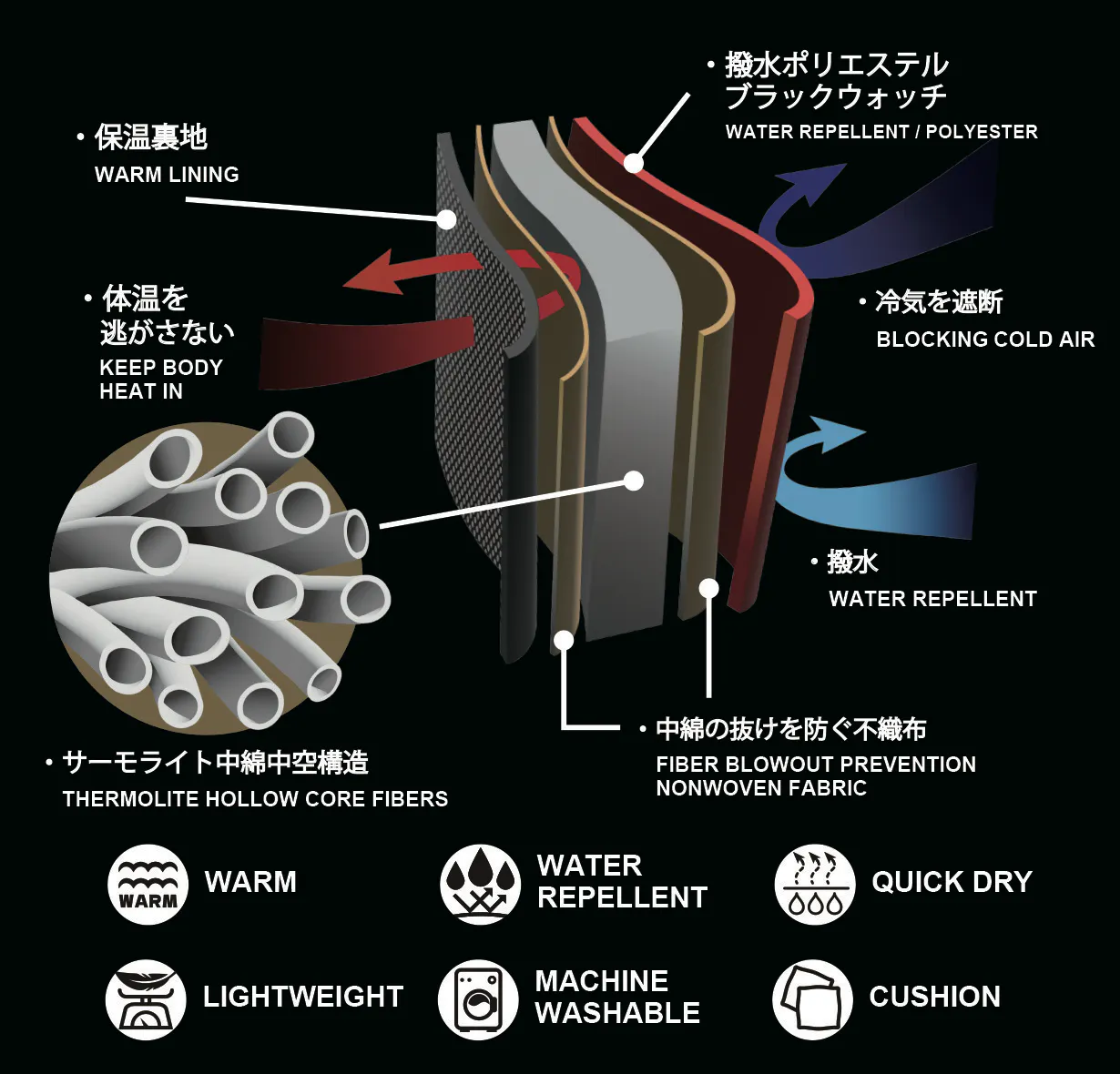 優れた保温性を持つインビスタ社のサーモライト中綿は、機能性が求められるスポーツ・アウトドア分野で数多くのアウターや寝袋を中心に使用されてきました。独自の繊維構造により暖かく快適さを提供する軽量保温素材です。