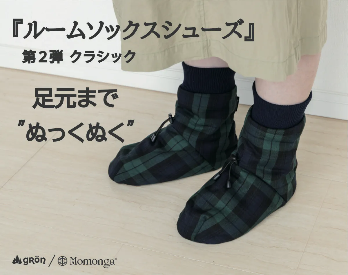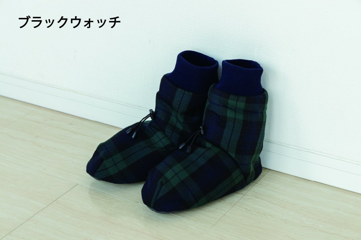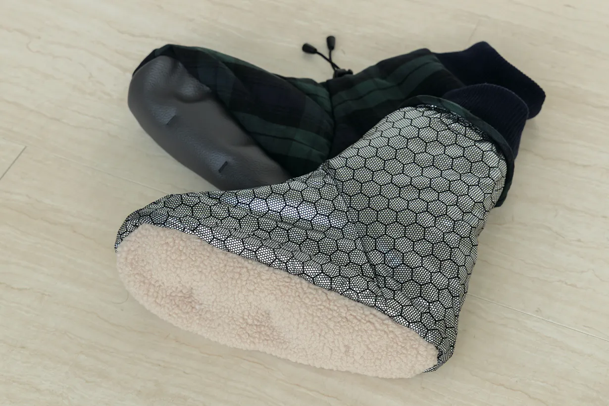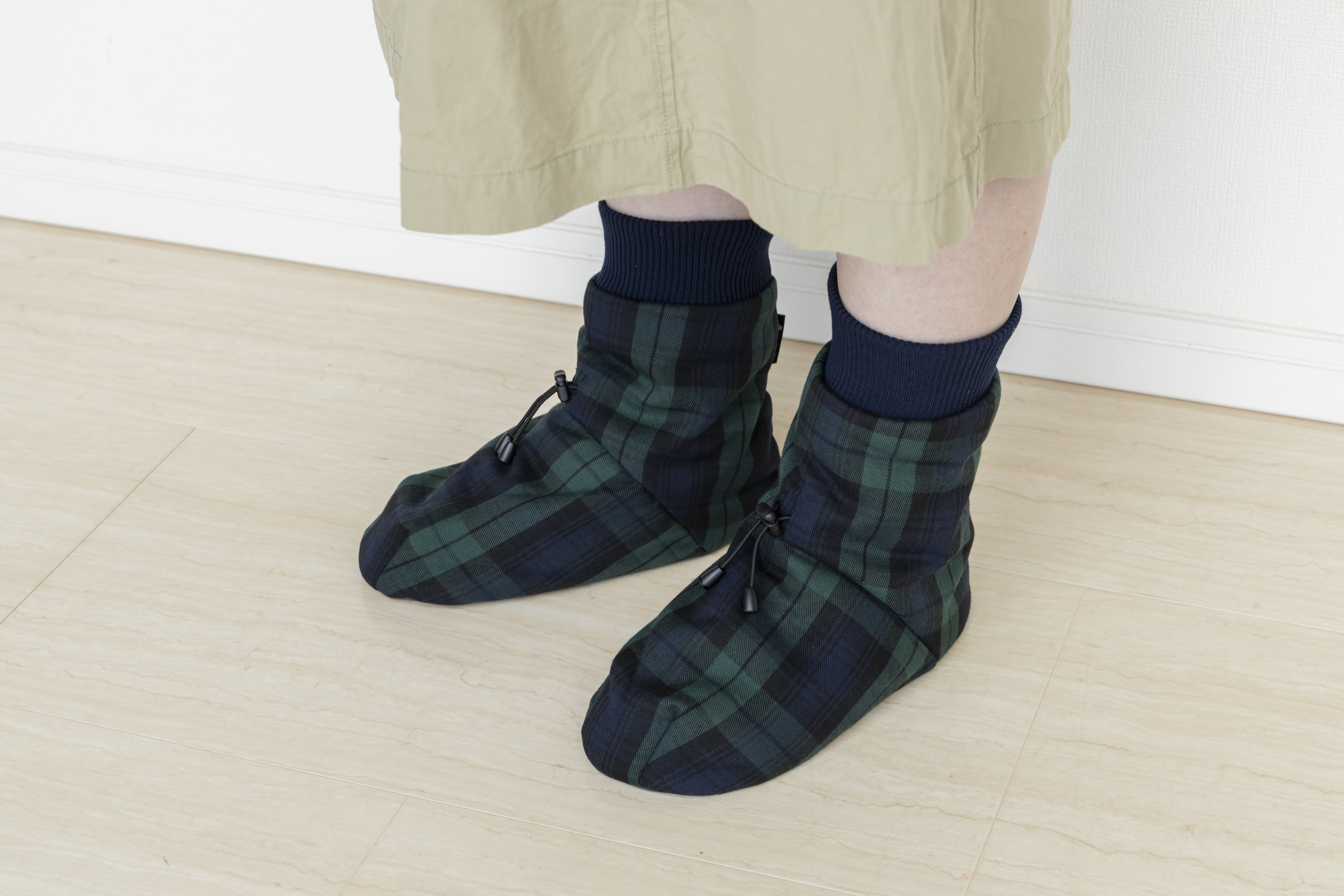 昨年誕生した「ルームソックスシューズ」が歩きやすく進化しました。足首部分をドローコードで調節できるようにし、脱げにくくなりました。足底の素材を変更し更に滑りにくくなりました。暖かさは去年と同等です。とてもとても暖かいです。