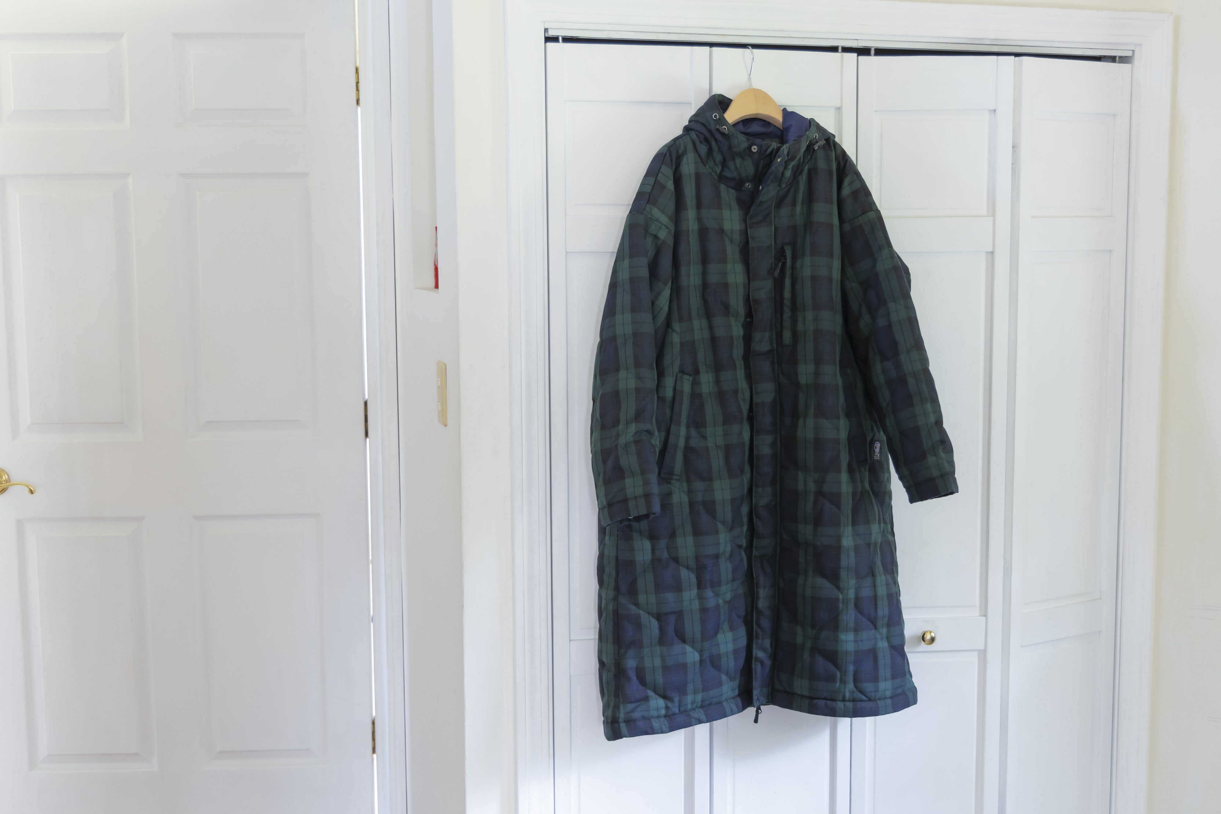 普通に街中でも着れる「ロングコート」に変身します。フロントファスナーは下からも開きます。