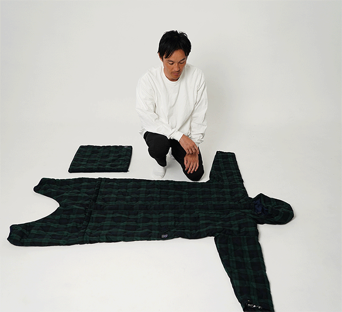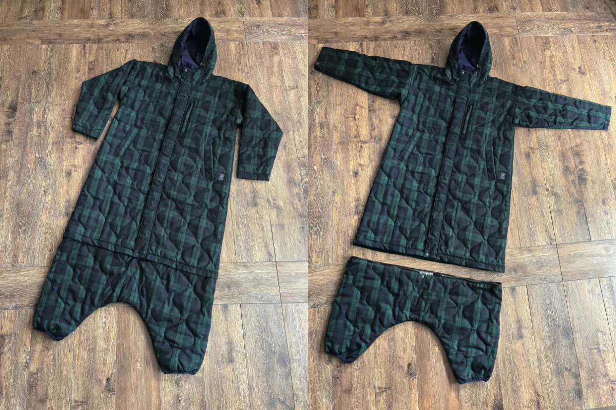 今回のプロジェクトでは「モモンガ」をもっといろんなシーンで使っていただけるようにと考え、足元部分を取り外すと「ロングコート」としてお使いいただけるようにしました。