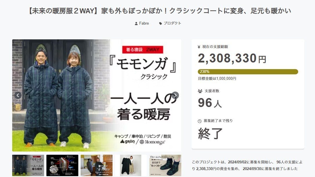 2024/10/04 13:59この度は【【未来の暖房服2WAY】家も外もぽっかぽか!クラシックコートに変身、足元も暖かい】プロジェクトにたくさんのご支援をいただき誠にありがとうございます。【 応援購入総額 : 2,308,330円 】【 サポーター人数 : 96人 】モモンガの使用としてはもちろんのこと、コートとして日常使いもできる万能デザインとなっておりますので、おうちでも屋外でもこの冬は【モモンガ2WAY】がみなさまのお役に立てることを願って生産を進めてまいります!これからもモモンガシリーズでは進化を続けていきたいと考えておりますので、今回のモモンガをご使用いただきましたら、ぜひ感じたことのご意見をいただけますと今後の商品開発の参考・励みになりますので、幸いです。リターン品のお届け予定は[ 2025年 1月下旬 ]となっております。*本製品は『受注生産』となっておりまして、プロジェクト終了後の「カラー・サイズ」変更につきましては原則としてご対応できかねますのでご了承ください。 もっと見る
