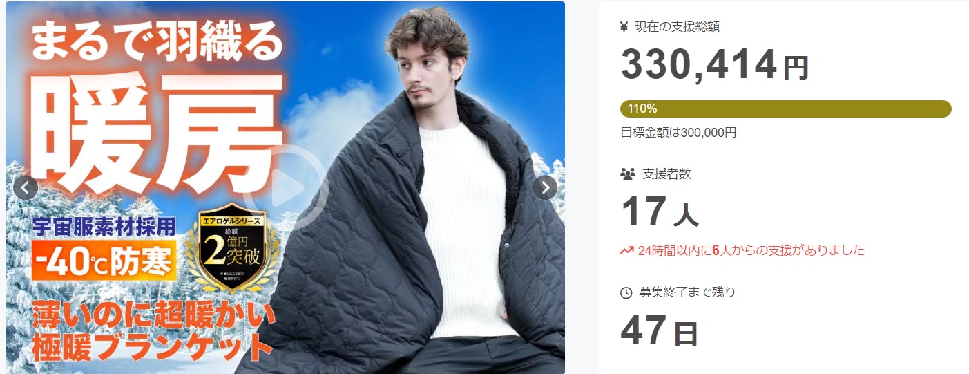 2024/11/13 15:11ご支援者の皆様この度は「WARM BLANKET」にご支援いただき、誠にありがとうございます。AGERU厳選ショップでございます。私たちのプロジェクト超極暖薄型ブランケット「WARM BLANKET」の目標金額を無事に達成することができました!本プロジェクトは公開後、17名の方々にご支援をいただいております。WARM BLANKETは「キャンプを愛する全ての人達の為のブランケット」です。凍える冬の寒さでも、これ1枚あれば暖かさが持続し快適なキャンプ体験ができます!エアロゲルシリーズのご愛用者様から多くのご要望をいただく中で、試作と改良を続けついに完成しプロジェクトとして起案することができました。★独自の4層構造で優れた保温力を実現し、最新素材である「エアロゲル羽毛」を採用することで非動物繊維で環境にも配慮。★丸洗い可能な製品の為、常に清潔でオールシーズン使用可能!真冬のキャンプ地や車中泊の寒さにも寄り添うブランケットとして、是非多くの方にお使いいただきたいです。皆さまからのご支援により、このプロジェクトの目標達成を大変嬉しく思っております。心より感謝申し上げます。今後は、製品の最終仕上げから生産・配送まで、丁寧に進めてまいります。引き続きプロジェクトの進行状況についても活動報告を通じてお知らせいたしますので、どうぞご期待ください。改めてご支援いただきました皆さまに心より感謝申し上げます。是非、SNSシェア等の商品拡散にもご協力いただけましたら幸いでございます。今後ともどうぞよろしくお願いいたします。AGERU厳選ショップスタッフ一同 もっと見る