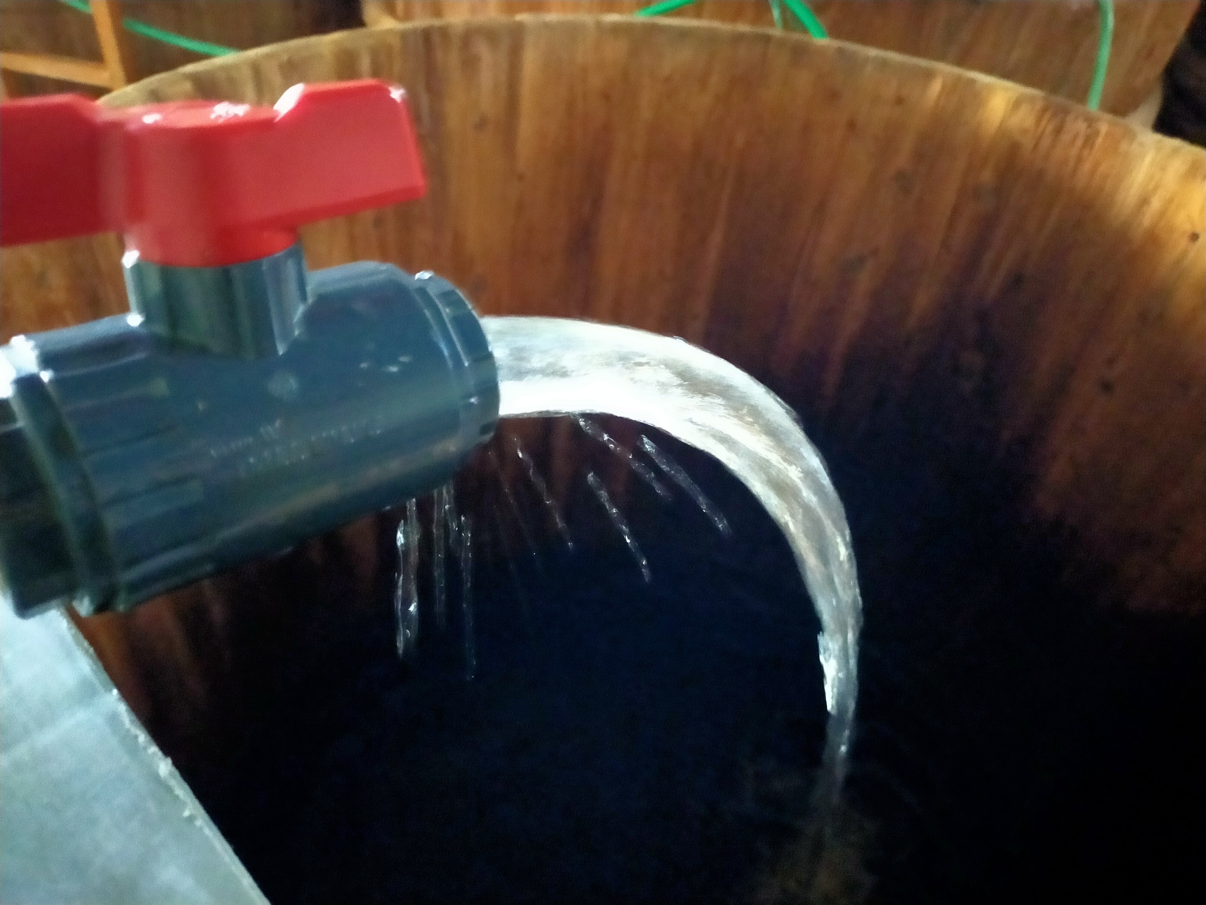 皆さんが思い浮かべる醤油の色が白醤油に移らないようにするには、木桶に水を張り残っている醤油を抜く必要があります。何回色抜き作業をする必要があるのかわからない、桶と向き合う日々が始まり、いよいよという雰囲気が現場には立ち込めていました。