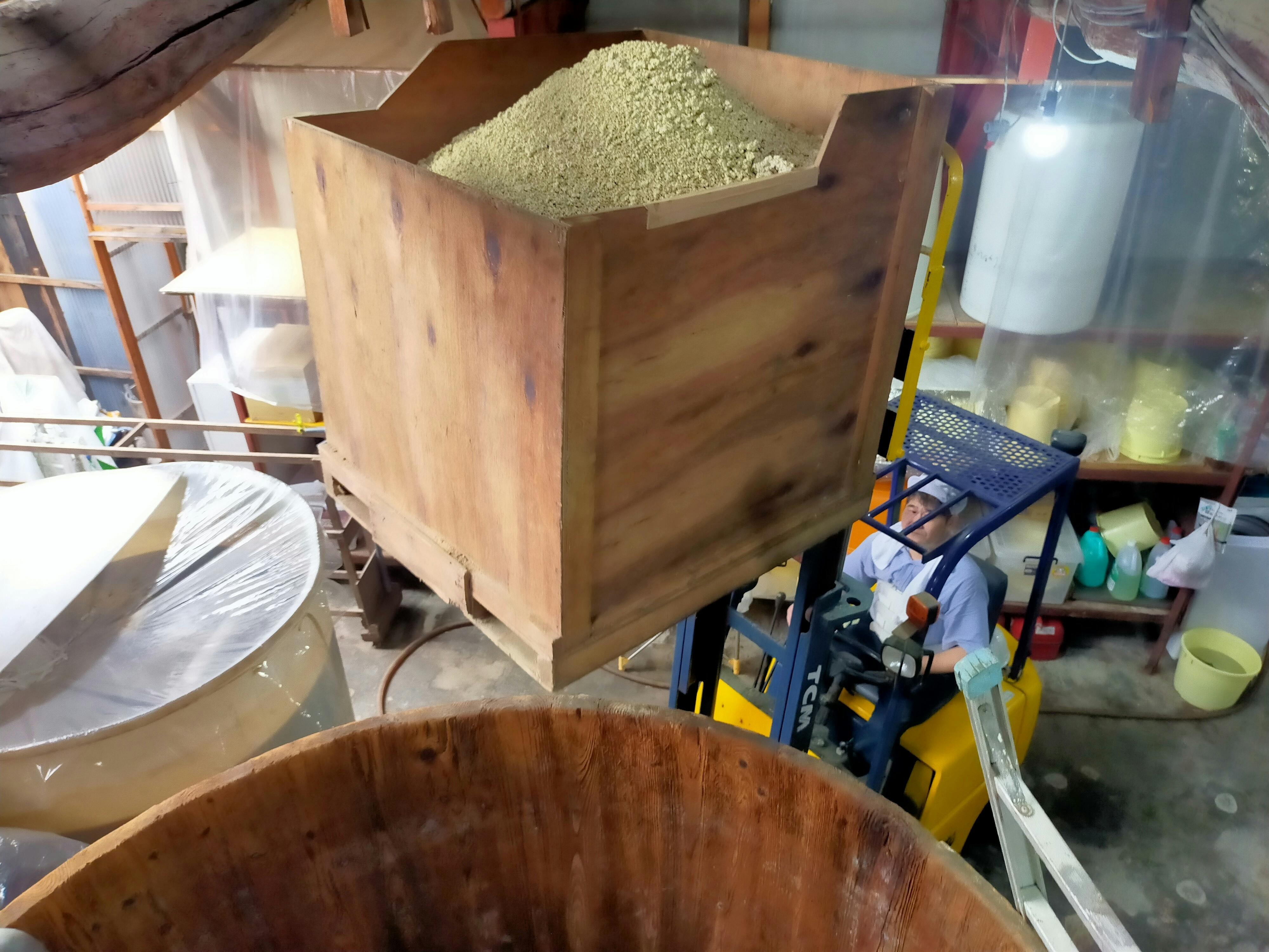 本日18日、仕込み(育った麹を木桶のなかで塩水と混ぜ合わせる作業)を無事にとり行うことができました。
