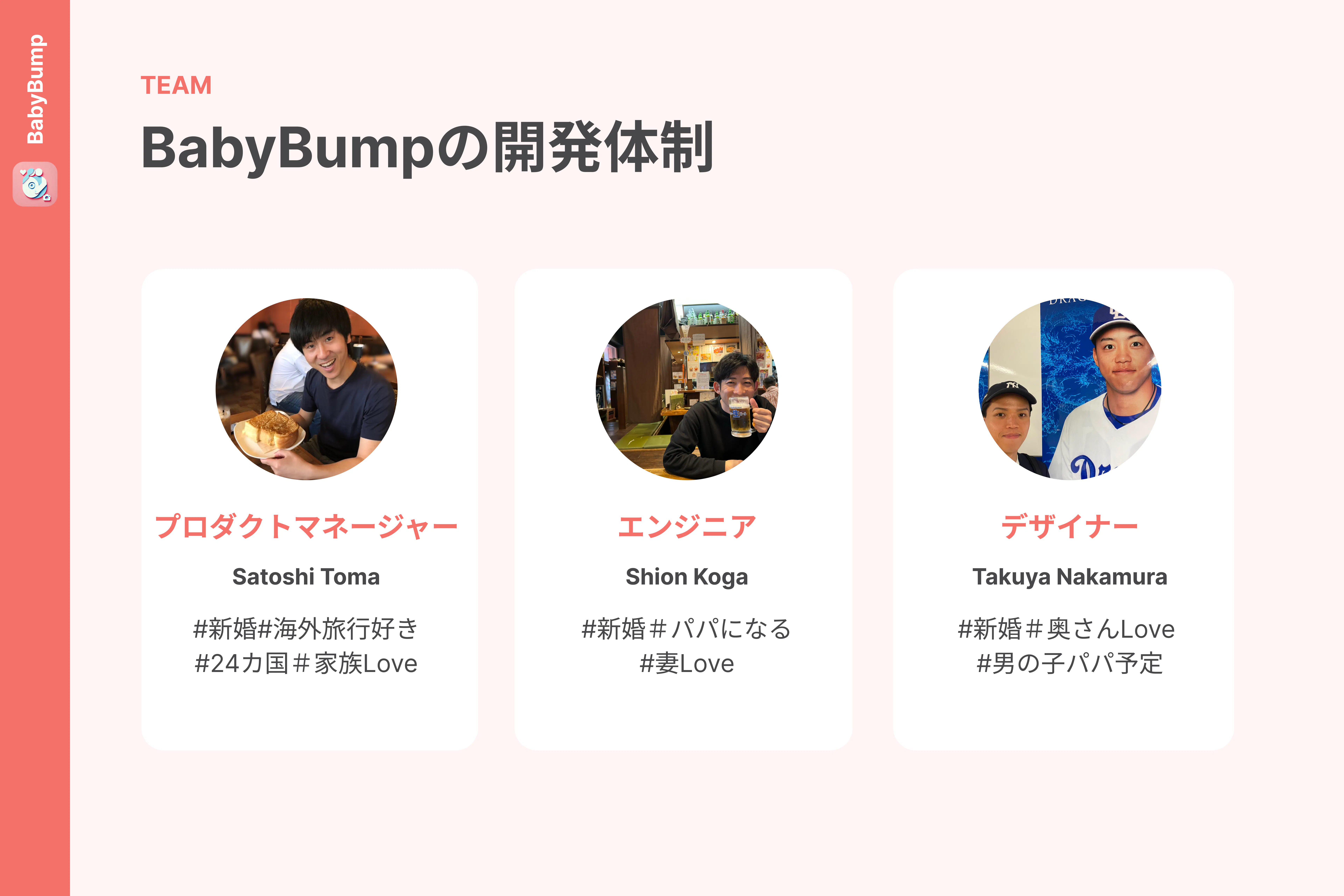 「BabyBump」はこの3人のメンバーで構成されています。私たちは、日々会社員としてアプリ開発に携わりながら、妊娠中の妻を持つメンバーや、将来子どもを持つことを夢見ているメンバーで集まりました。