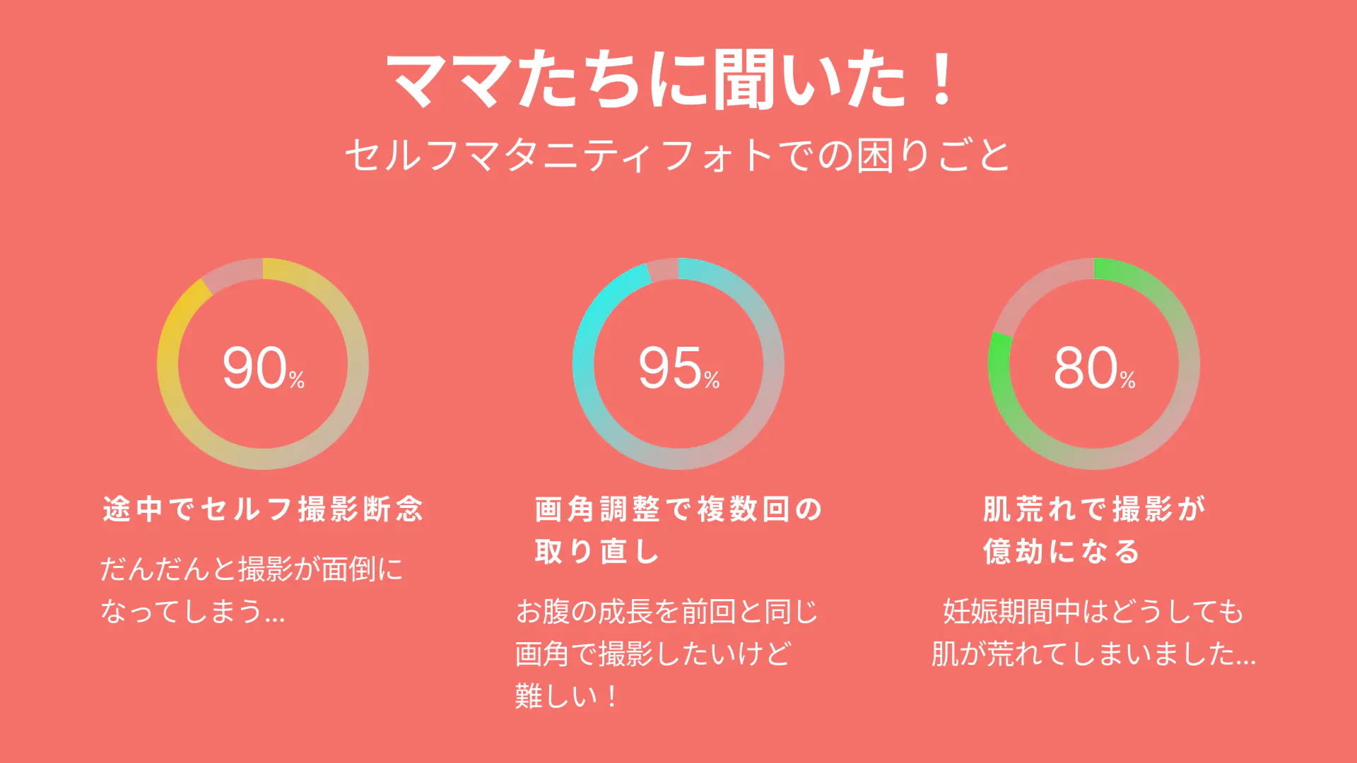 他の妊婦さんに意見を聞いてみても、多くの人が同じような悩みを抱えていました。写真を継続的に残したかったけれど大変で諦めてしまったり、撮影できても加工や取り直しに苦労しているという声が多かったのです。