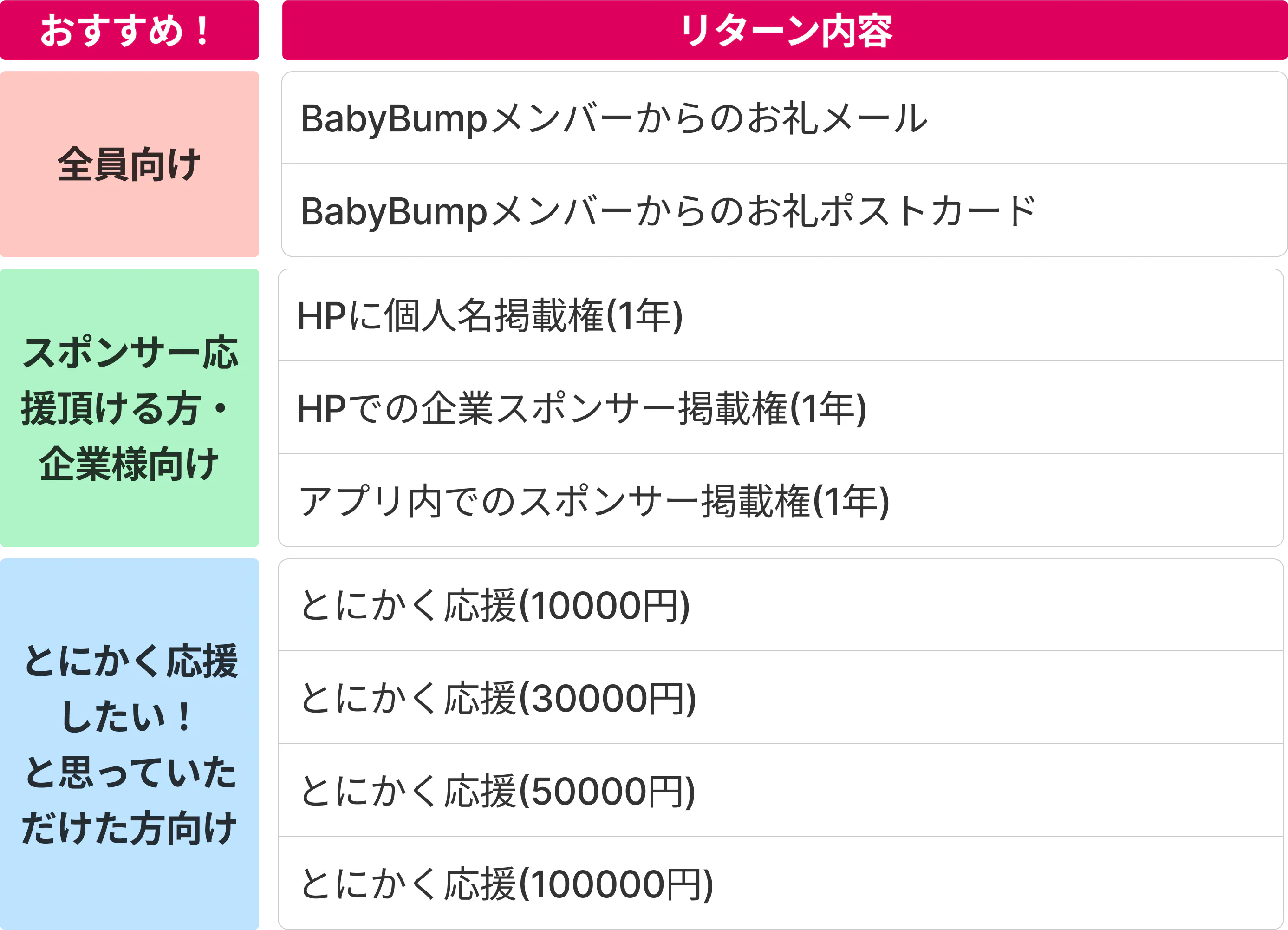 さらにBabyBumpベータ版(iOS)先行利用権に加え、AppleStoreリリースまでの間、エバンジェリストとしてアイデア出しに参加頂くなど、より良いアプリを一緒に開発していくリターンもご用意しております。