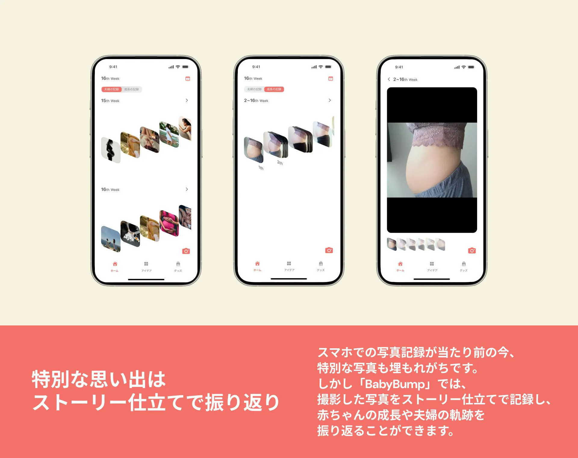 妊娠期間をサポートするアプリはたくさんありますが、妊娠中の体調や気分の変化が大きい時でも、簡単にマタニティフォトを残せるアプリは見つかりませんでした。