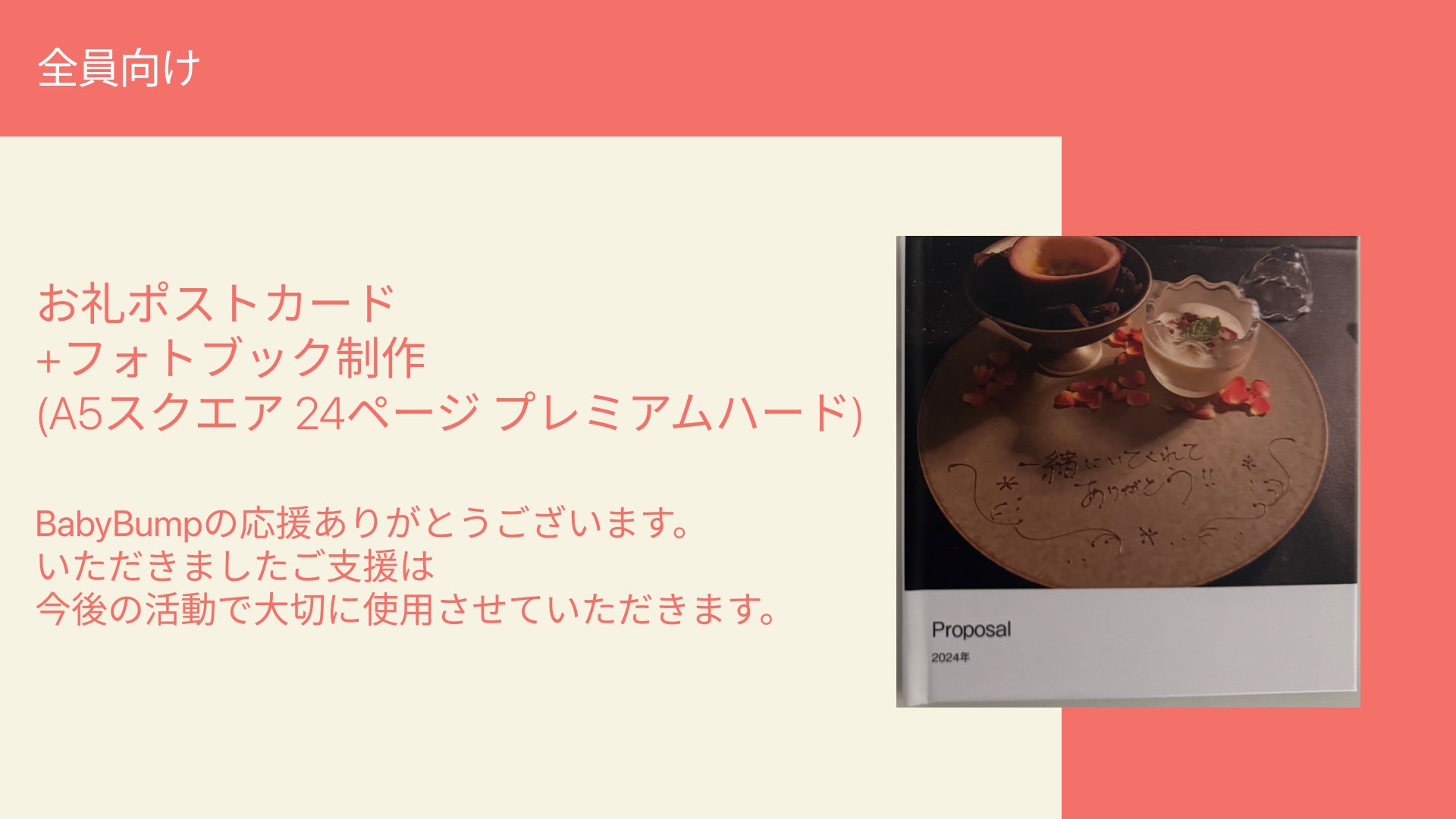 現在のところ最も人気の高いリターンであるフォトブック制作は、皆様が日頃から大切に撮り溜めている思い出のお写真をBabyBumpチームが心を込めてフォトブックにさせて頂きます。