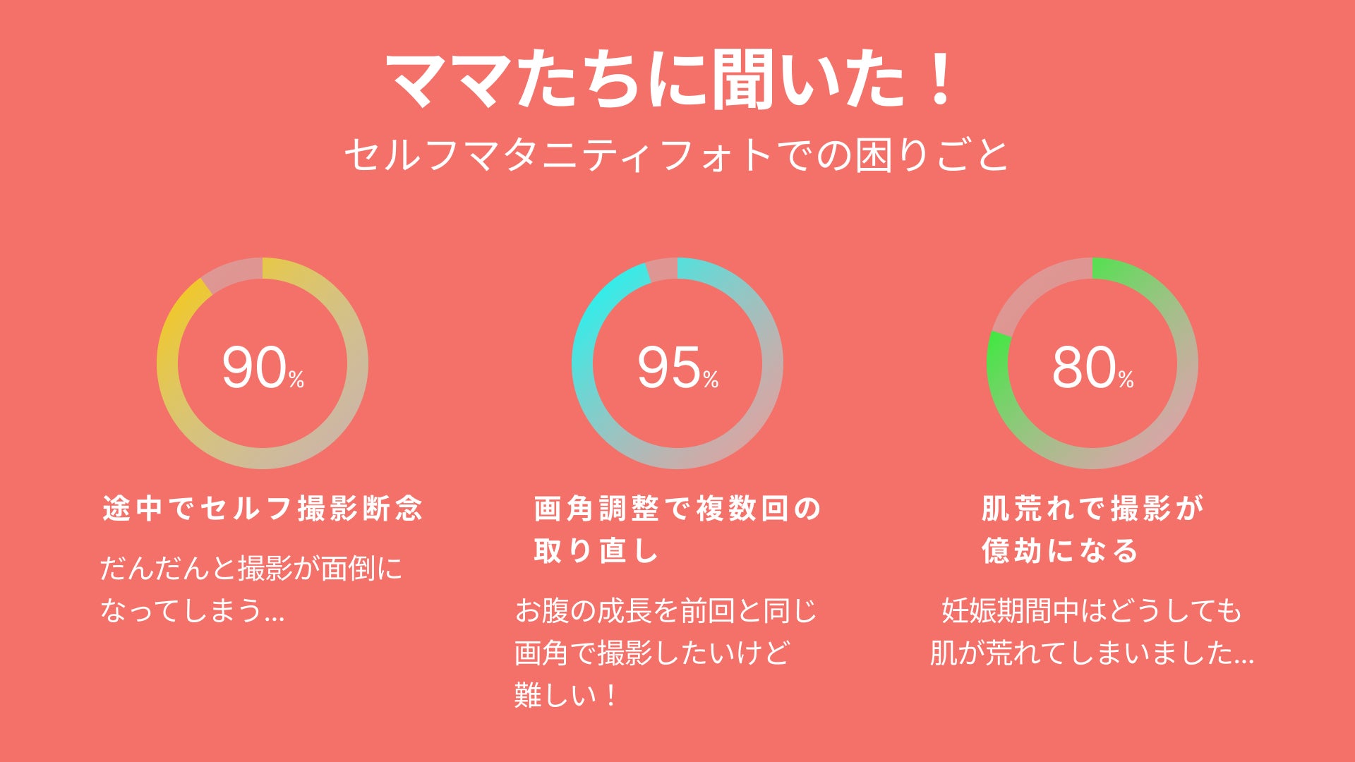 他の妊婦さんに意見を聞いてみても、多くの人が同じような悩みを抱えていました。写真を継続的に残したかったけれど大変で諦めてしまったり、撮影できても加工や取り直しに苦労しているという声が多かったのです。