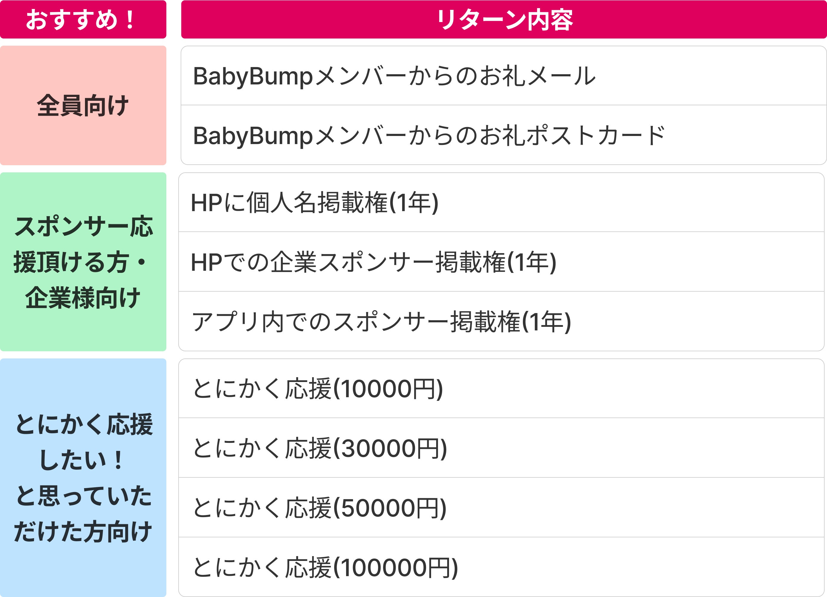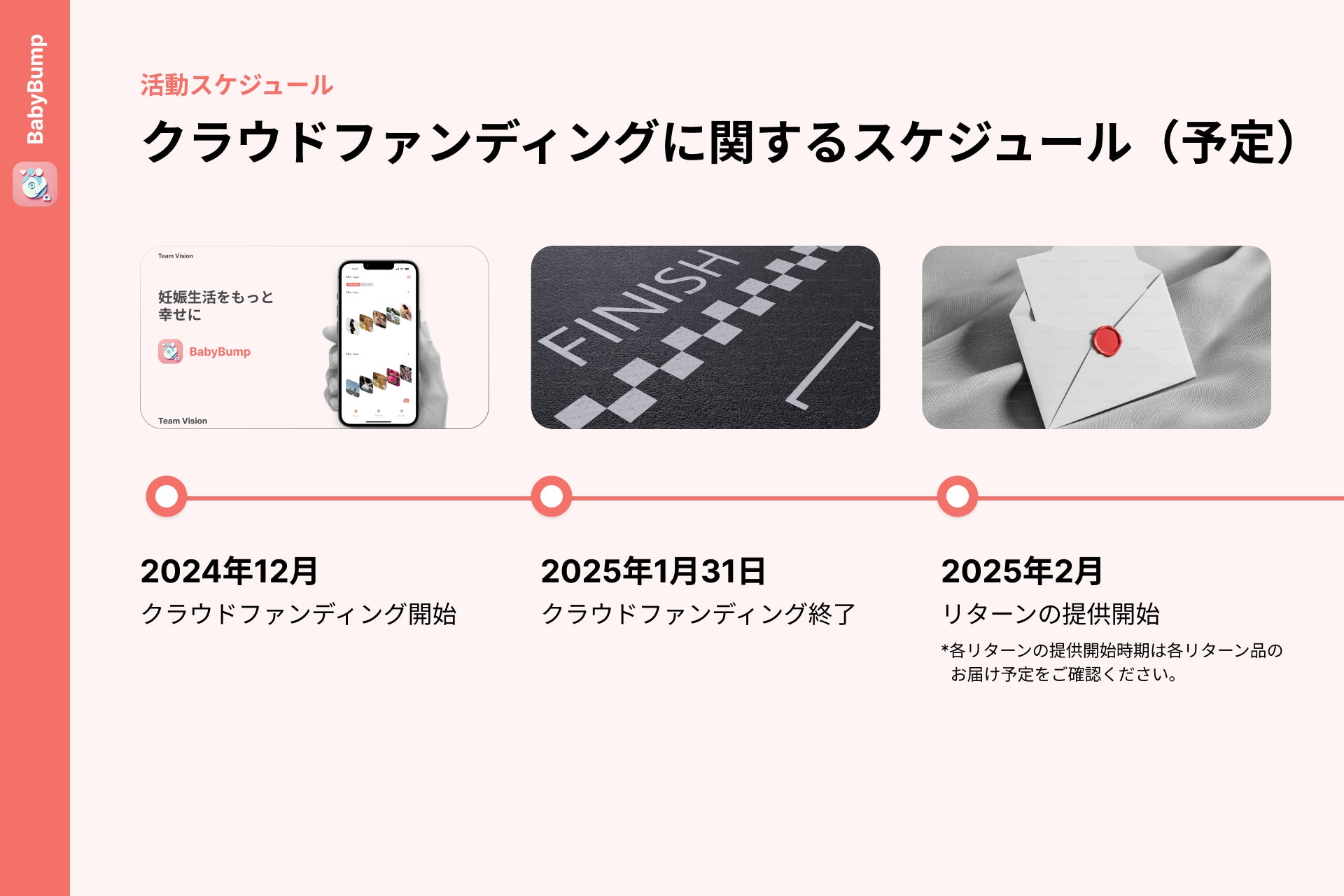 さらにBabyBumpベータ版(iOS)先行利用権に加え、AppleStoreリリースまでの間、エバンジェリストとしてアイデア出しに参加頂くなど、より良いアプリを一緒に開発していくリターンもご用意しております。